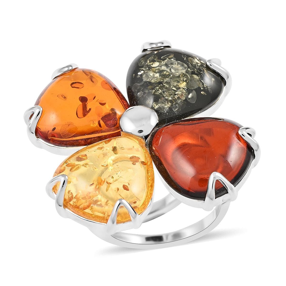 Inspired by a four-petal flower, this multi-colored amber ring signifies wholeness, beauty, and union. This ring features trilliant cut multi-colored gems arranged to form the petals of a flower. The fancy prongs firmly grip the gems safeguarding and intensifying their beauty. This open-band floral ring is easy to wear and gets adjusted as per your finger size. The modified shank adds a contemporary look to the piece. Amber is an organic gem formed tens of millions of years ago, that contains living or once-living organisms, thus making this ring more adorable. Floral jewelry is in trend for its beauty, elegance, and feminine touch. Jewelry made of organic gems has always been popular throughout history as they reflect their natural form, and their beauty is unmatched. Crafted in sterling silver, this floral Amber ring suits all outfits.