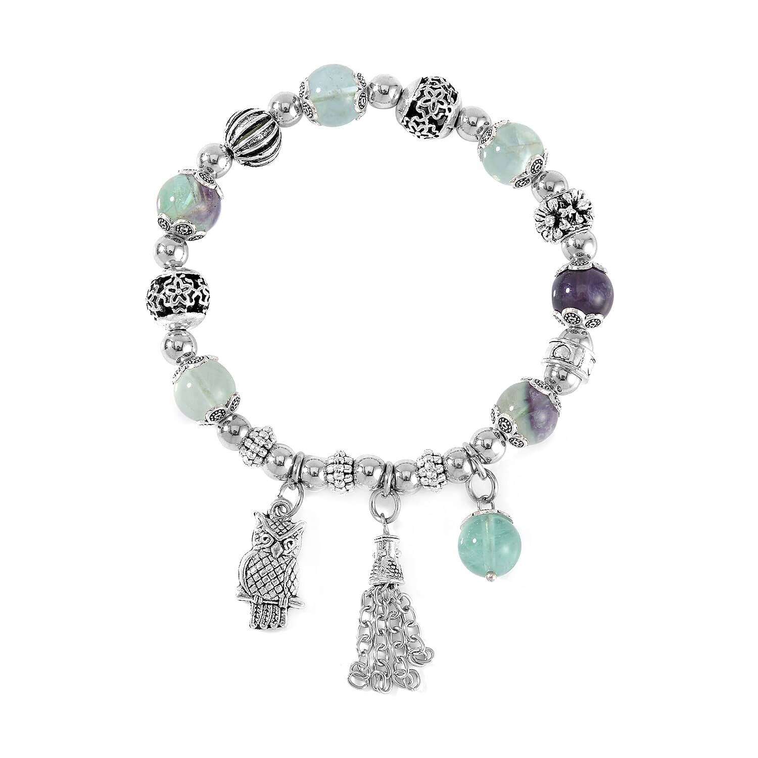 Multi Fluorite 57.80 ctw Beaded Stretch Bracelet with Silvertone Charm