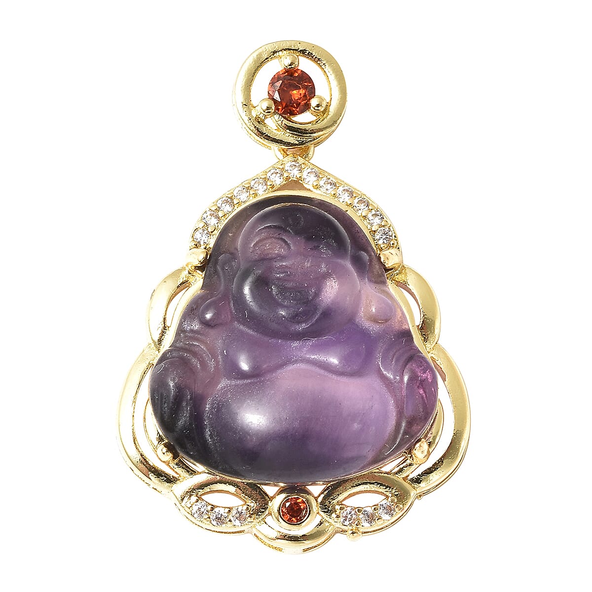 Multi Fluorite Carved Laughing Buddha, Multi Gemstone Pendant in Goldtone 25.00 ctw