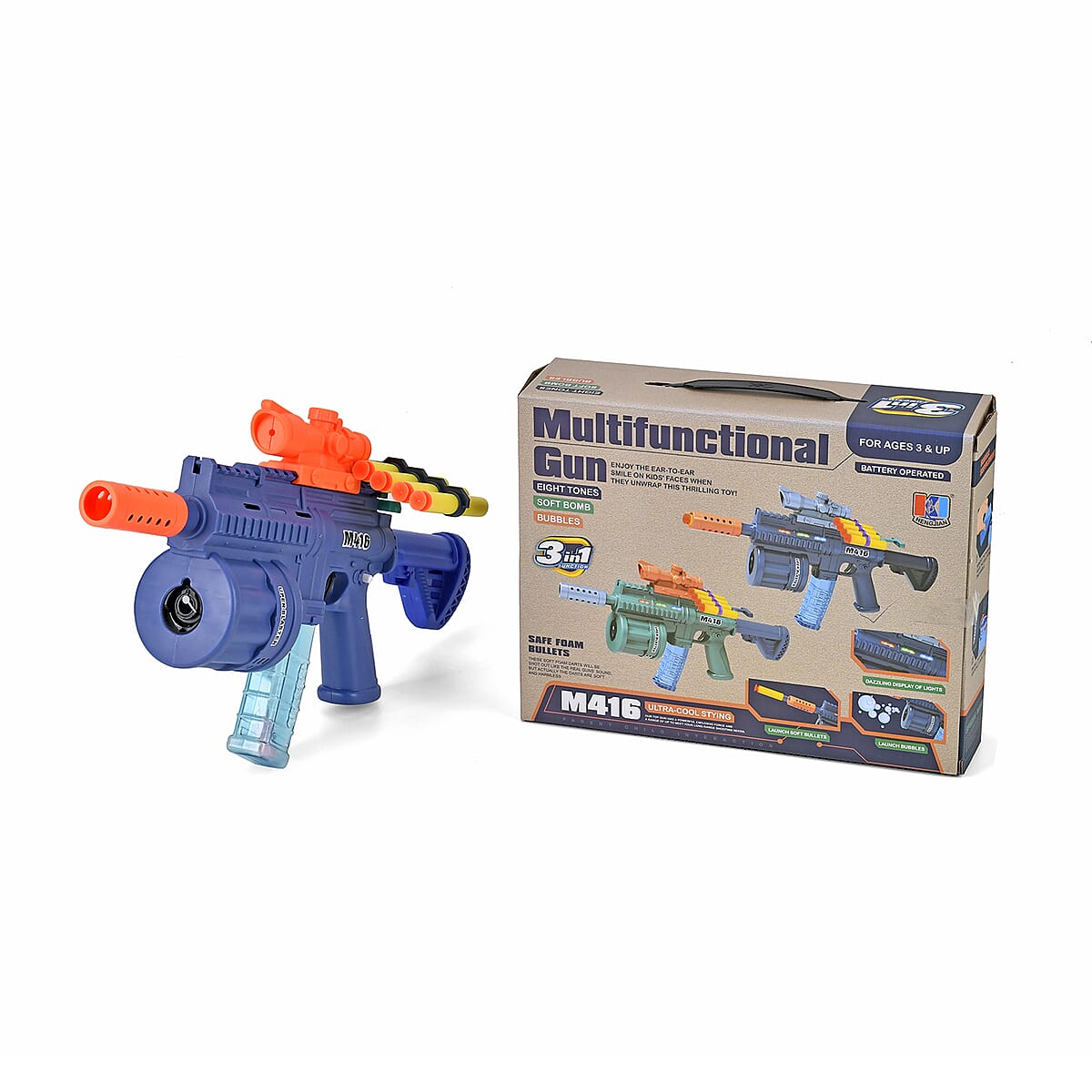 Multi Functional 3-in-1 Bubble Gun with Two Bottles of Bubble Liquid and 8 Soft Foam Bullets (3 AA batteries Not Included)