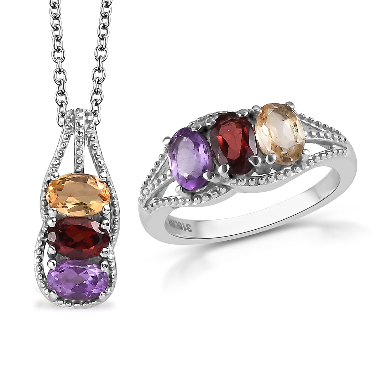 Multi Gemstone 3 Stone Ring (Size 5) and Pendant Necklace 20 Inches in Stainless Steel 2.85 ctw