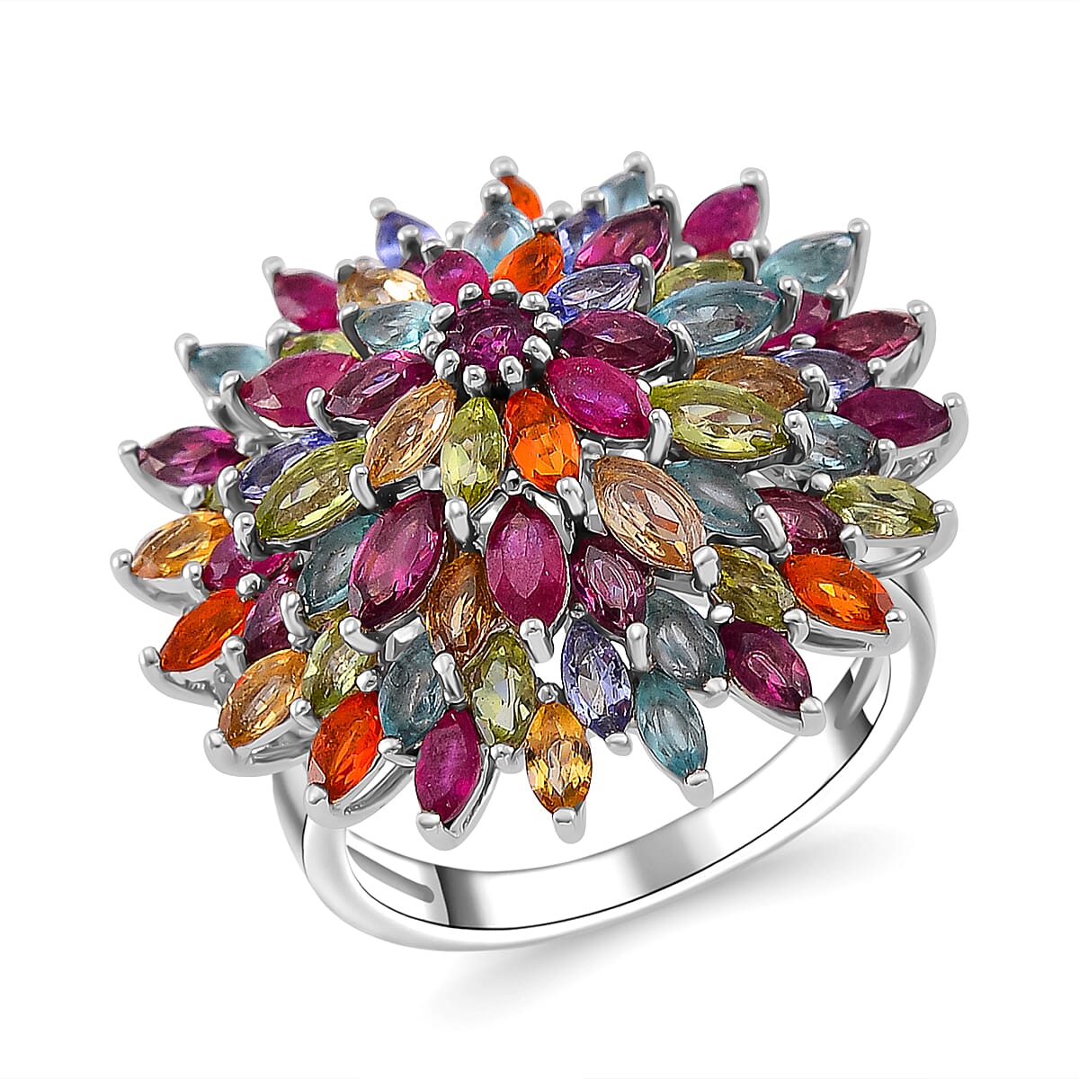 Multi Gemstone Floral Spray Ring in Rhodium Over Sterling Silver (Size 6.0) 6.60 ctw