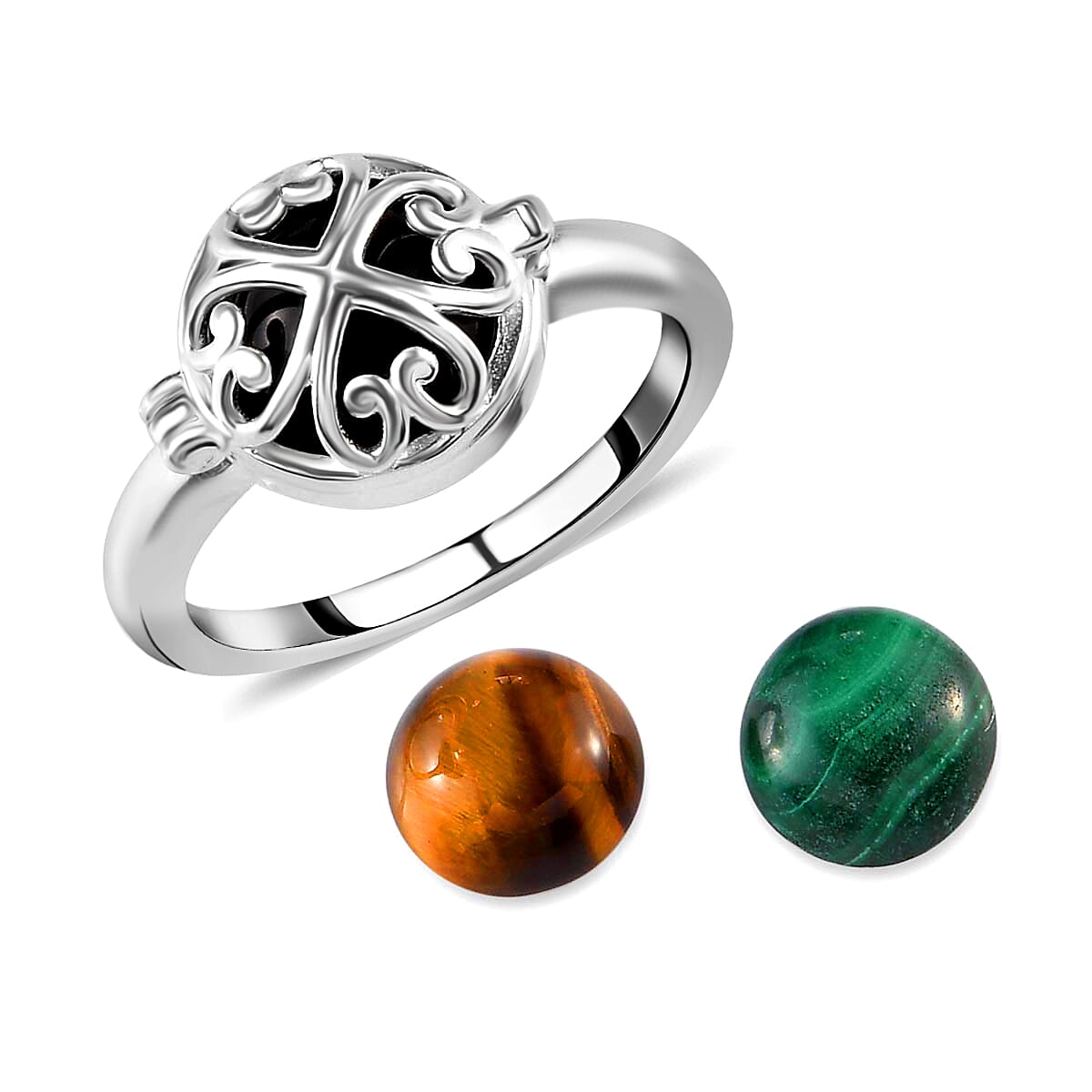 Create your own personalized ring with this multi-gemstone interchangeable jewel. With three options of gemstones - black onyx, African malachite, and tiger's eye, this interchangeable ring allows you to mix and match with any of your ensembles. The smooth metal scrolls create a cage over the gemstone further completing the design, and adding a touch of the vintage look. With interchangeable gemstones, this 3-in-1 ring is crafted in stamped 925 sterling silver.