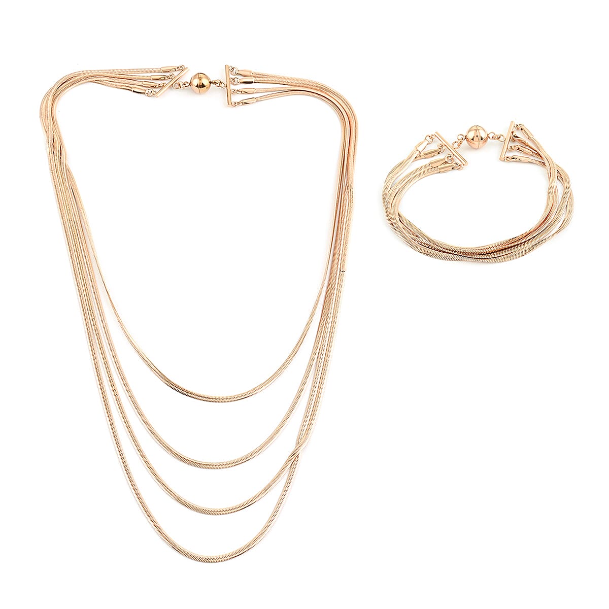 Multi Layer Snake Chain Bracelet (8In) and Necklace 20 Inches in ION Plated Rose Gold Stainless Steel 48.35 Grams