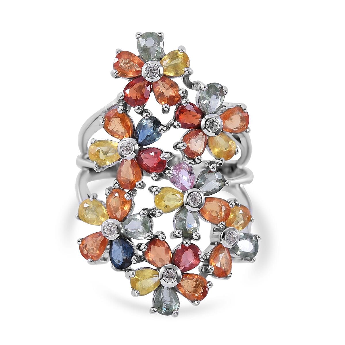 Multi Sapphire and White Zircon 6.20 ctw Floral Ring in Platinum Over Sterling Silver (Size 7.0)