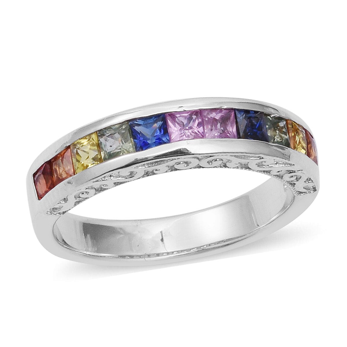 ·PRODUCT DETAILS: This band ring features square cut multi sapphire gemstones in channel setting, measuring 2.75mm. Set in stamped 925 sterling silver with platinum plating. The metal is durable and tarnish resistant.