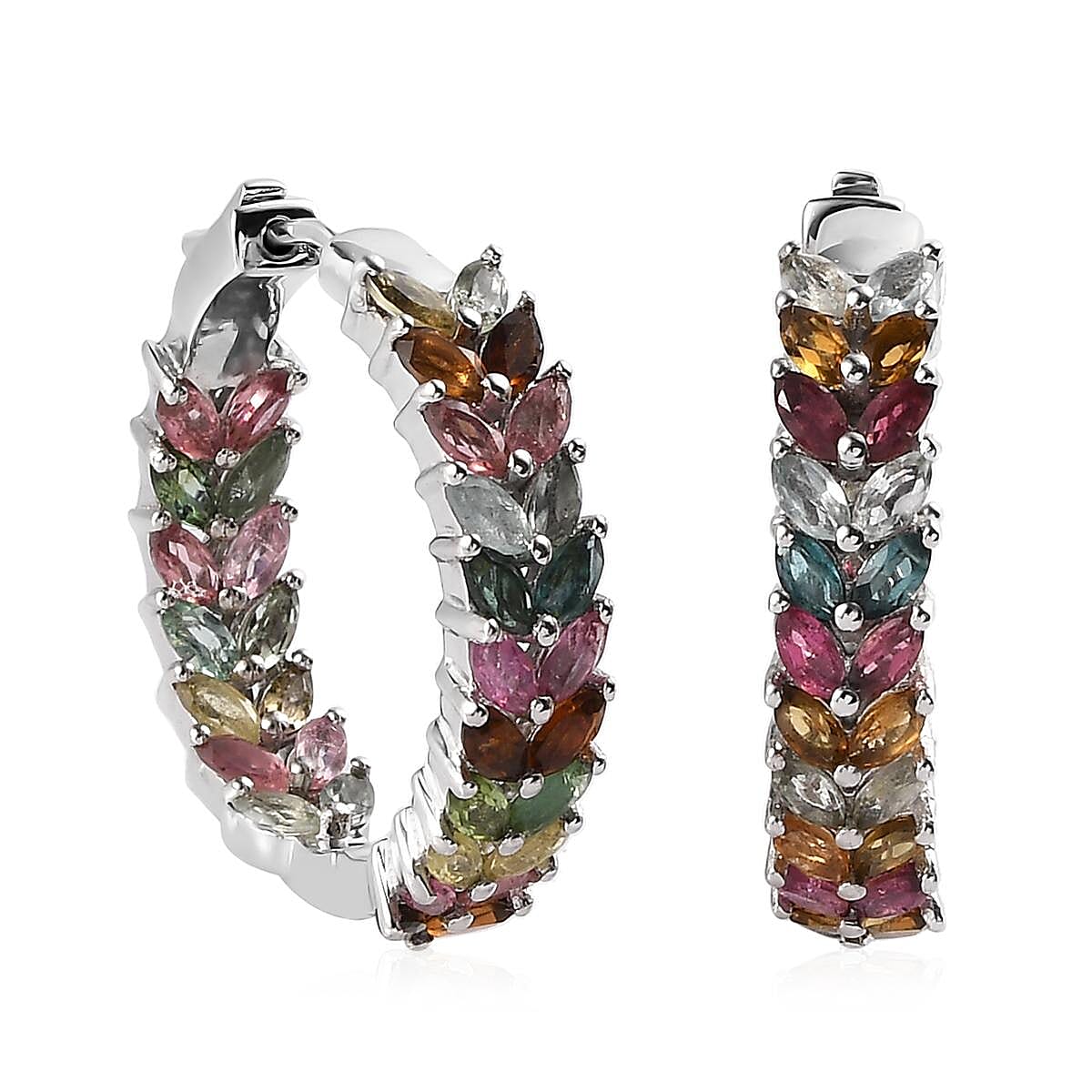 Multi-Tourmaline J Hoop Half Hoop Earring in Platinum Overlay Sterling Silver 6.05 ctw , Silver Wt. 11.3 g