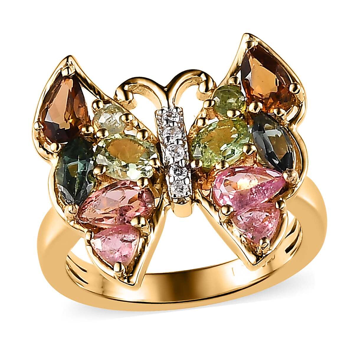 Multi-Tourmaline and White Zircon Butterfly Ring in Vermeil Yellow Gold Over Sterling Silver (Size 5.0) 1.60 ctw