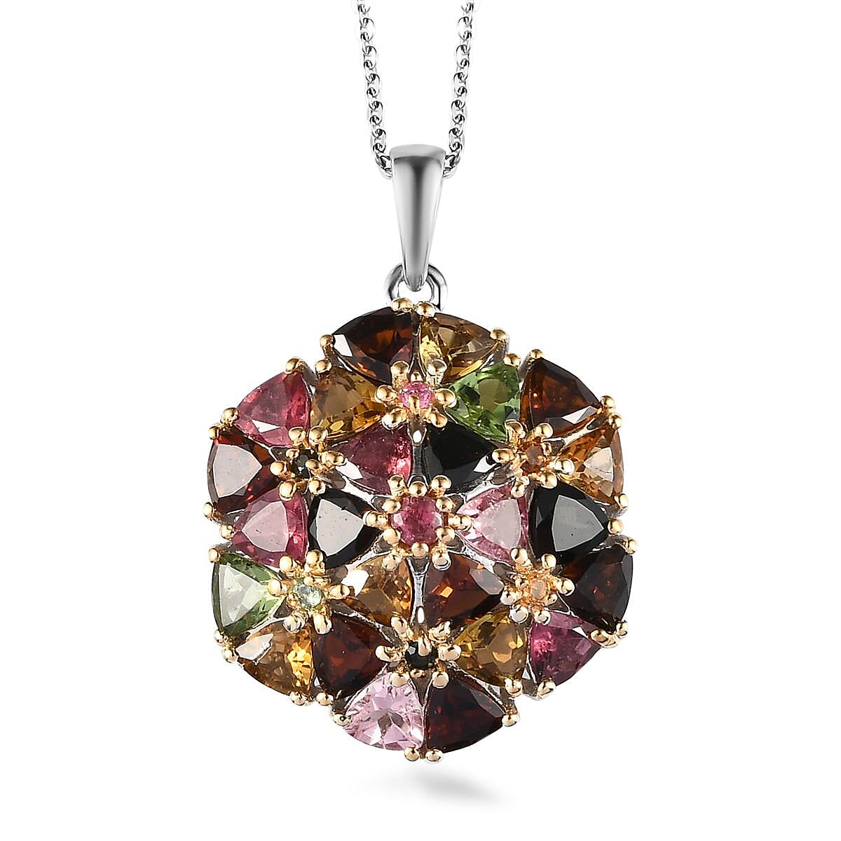 Multi-Tourmaline Cluster Pendant Necklace 20 Inches in 14K Yellow Gold and Platinum Over Sterling Silver 5.15 ctw