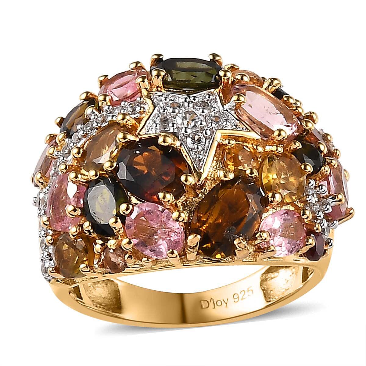 Elevate your fashion ensemble with the vibrant allure of our multi-tourmaline cluster ring. Plated in luxurious vermeil yellow gold over sterling silver, this exquisite silver ring features a dazzling array of multi-colored tourmalines masterfully arranged in a captivating star design at the center. Ideal for women who adore a splash of color and celestial elegance, this tourmaline ring is a perfect harmony of fashion and fancy.