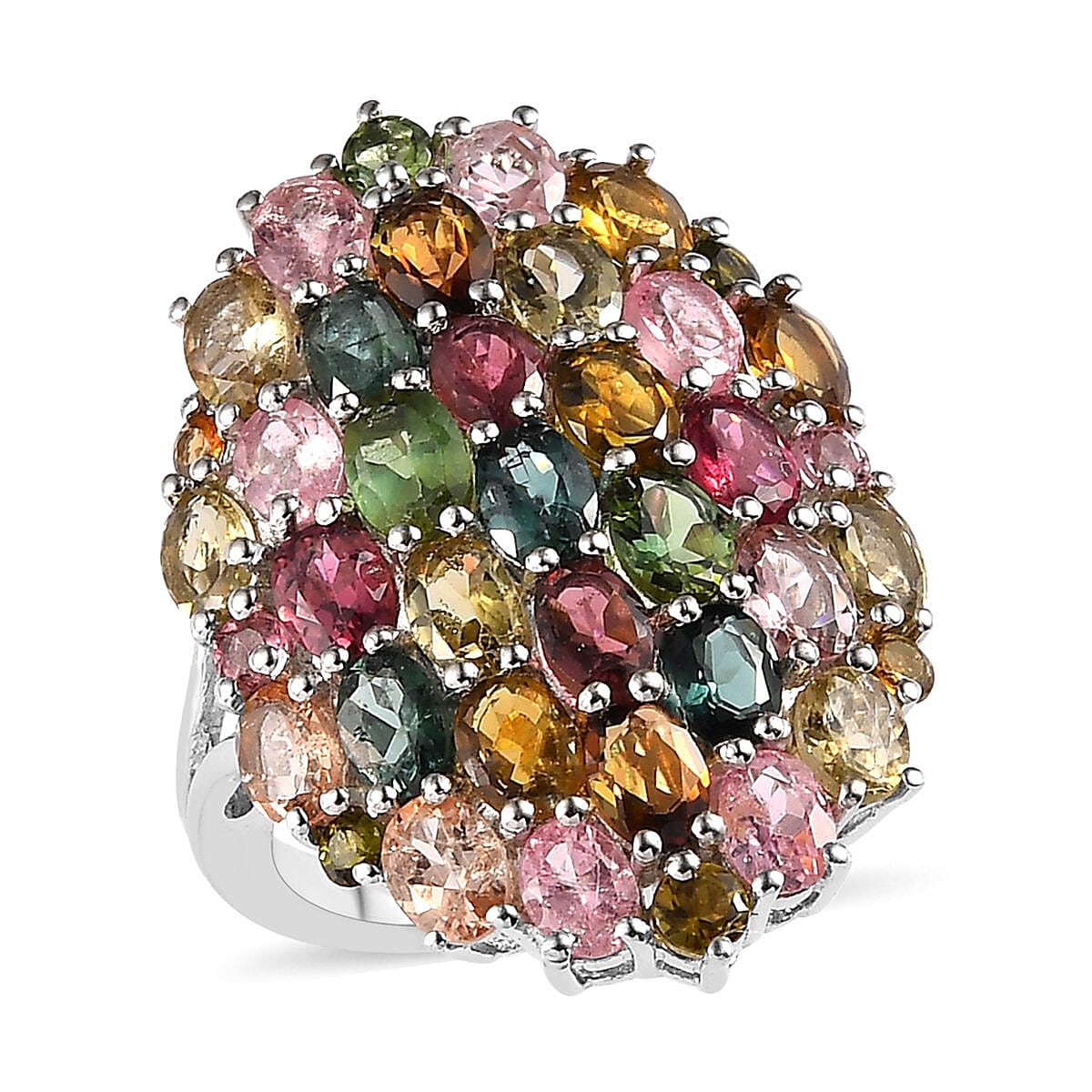 This multi-tourmaline ring is inspired by a cluster design. This stunning ring features a cluster of beautiful gemstones in an elongated design. This ring is crafted in sterling silver. Combining these vibrant gemstones with a sleek platinum finish makes this tourmaline cluster ring offer a modern and sophisticated look.