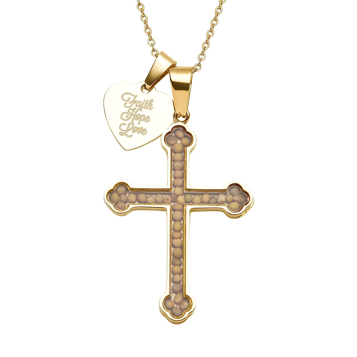Mustard Seed Cross Pendant Necklace 24 Inches with Heart Charm in ION Plated YG Stainless Steel