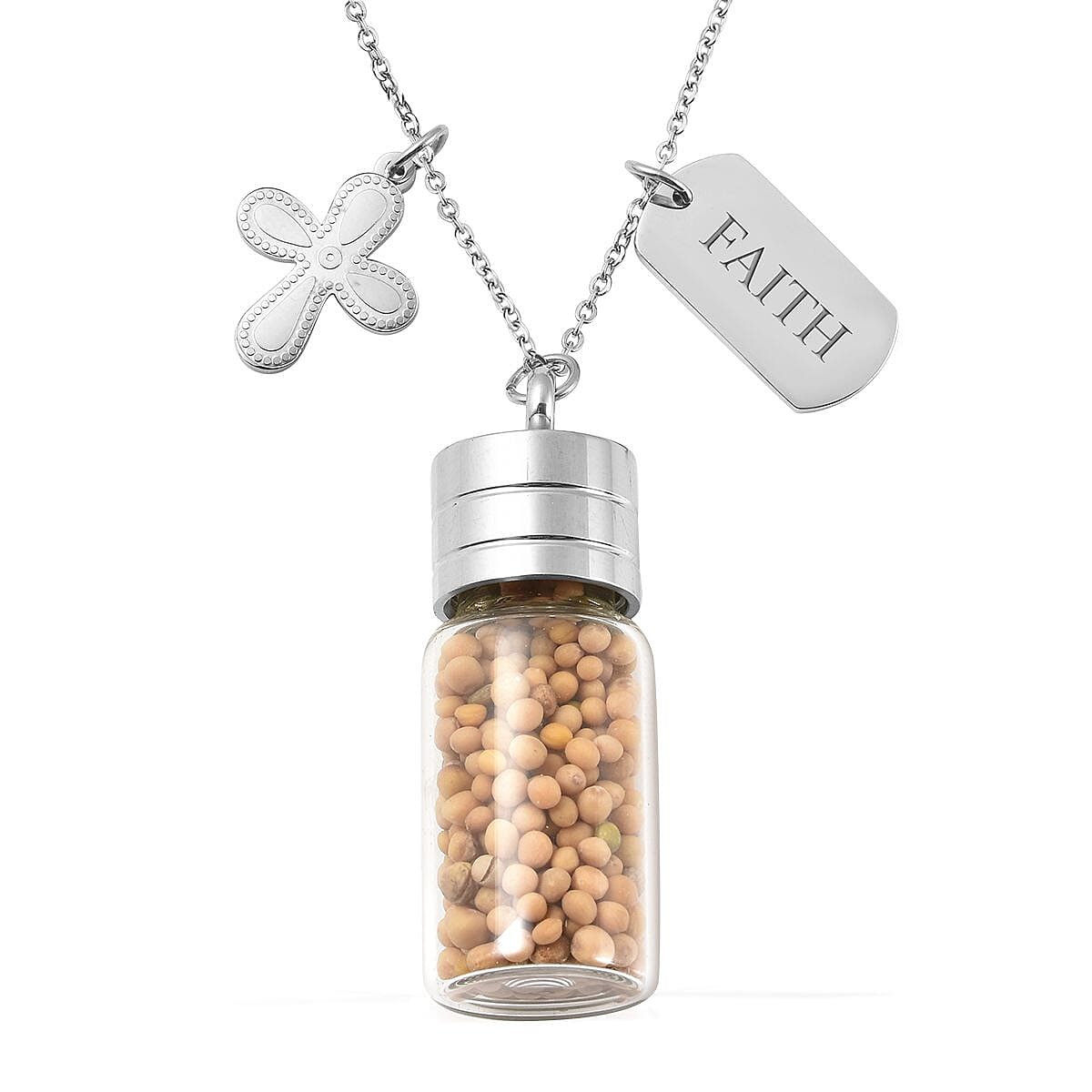 Beautifully express your faith with this uniquely designed mustard seeds glass bottle charm pendant necklace. Crafted in 316L stainless steel, this pendant necklace features a glass tube filled with mustard seeds, dangling on a linked chain with a faith engraved charm. The mustard seed is known as a symbol of faith. Mustard Seeds jewelry reminds you that even our tiny steps of faith can move mountains. It is often said that nothing will be impossible for the wearer if they wear a mustard seed necklace. This uncommon charm pendant necklace features 20inches matinee length and lobster clasp security.