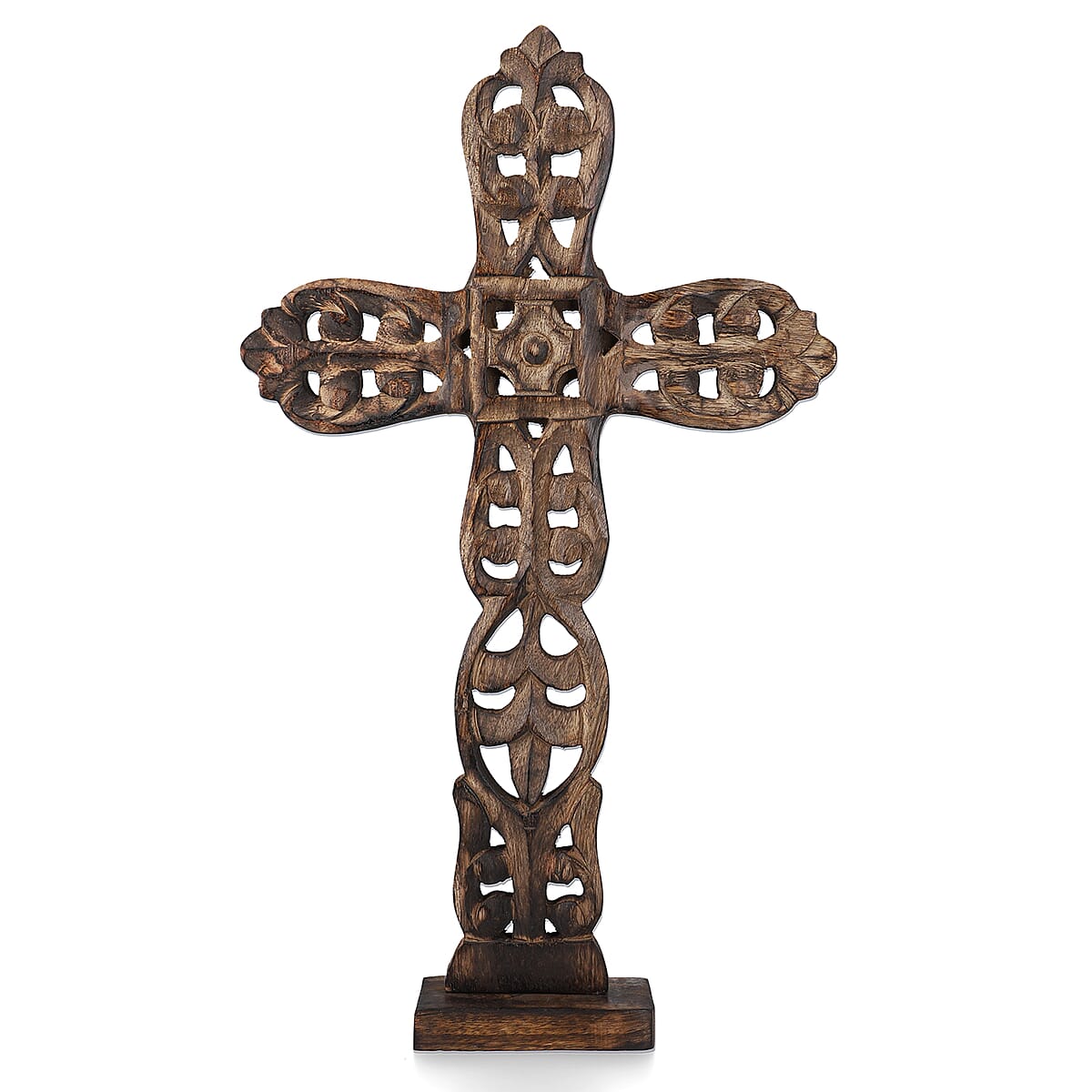 Bring elegance and a sense of serenity to your home with this handcrafted wooden cross. Expertly carved from durable mango wood, it showcases intricate lattice-inspired detailing that reflects artisanal craftsmanship. Designed for versatile display, it can stand on surfaces, hang on walls or doors, and complement spaces used for meditation, aromatherapy, or spiritual practice.
