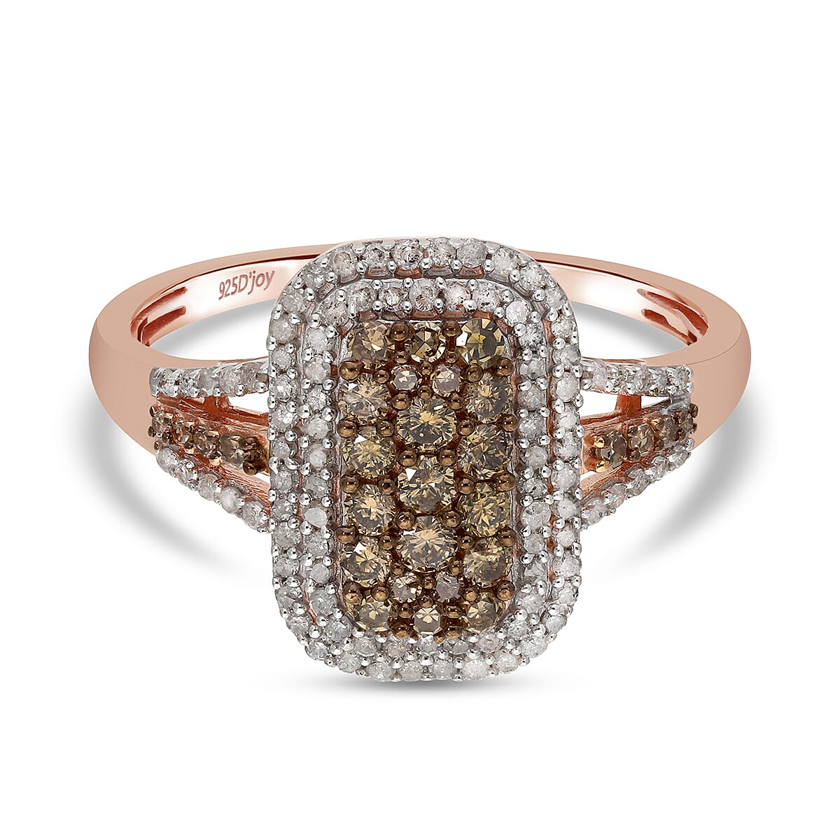 Natural Champagne and White Diamond Baguette Shape Double Halo Ring in Vermeil Rose Gold Over Sterling Silver 1.00 ctw