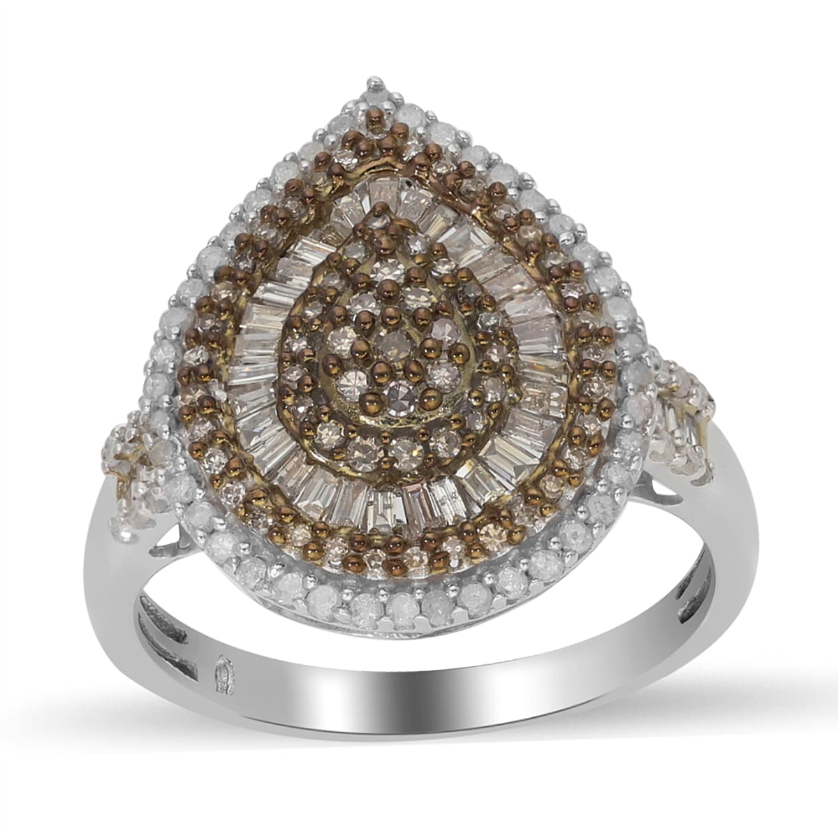 Natural Champagne and White Diamond Pear Shape Ring in Platinum Over Sterling Silver (Size 7.0) 1.00 ctw