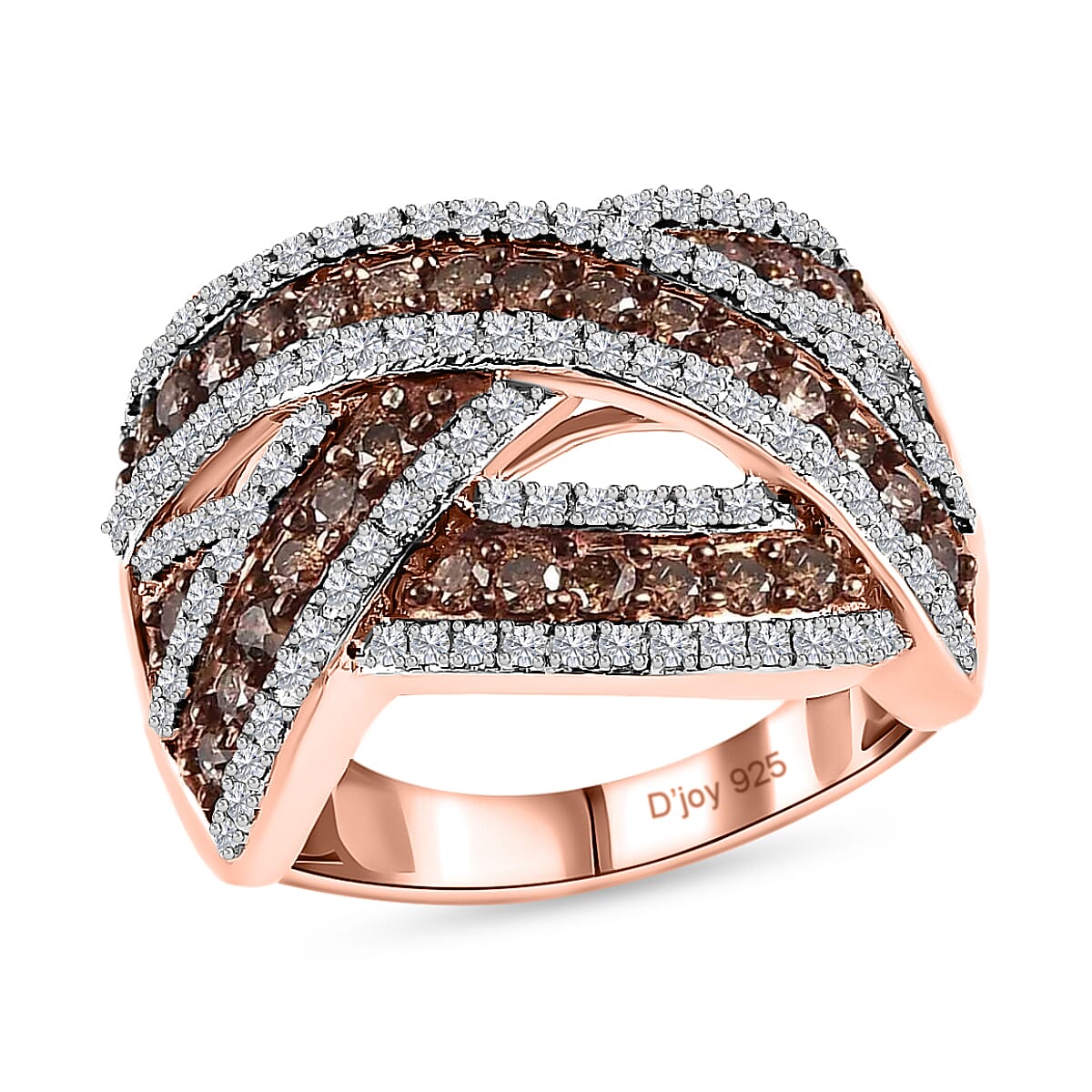 Dive deep into glamour and artistry with this magnificent natural champagne and white diamond crisscross ring. Bathed in the warm hues of vermeil rose gold, this exquisite piece showcases a dance of natural champagne and white diamonds, symbolizing the intertwining journeys of life and love.