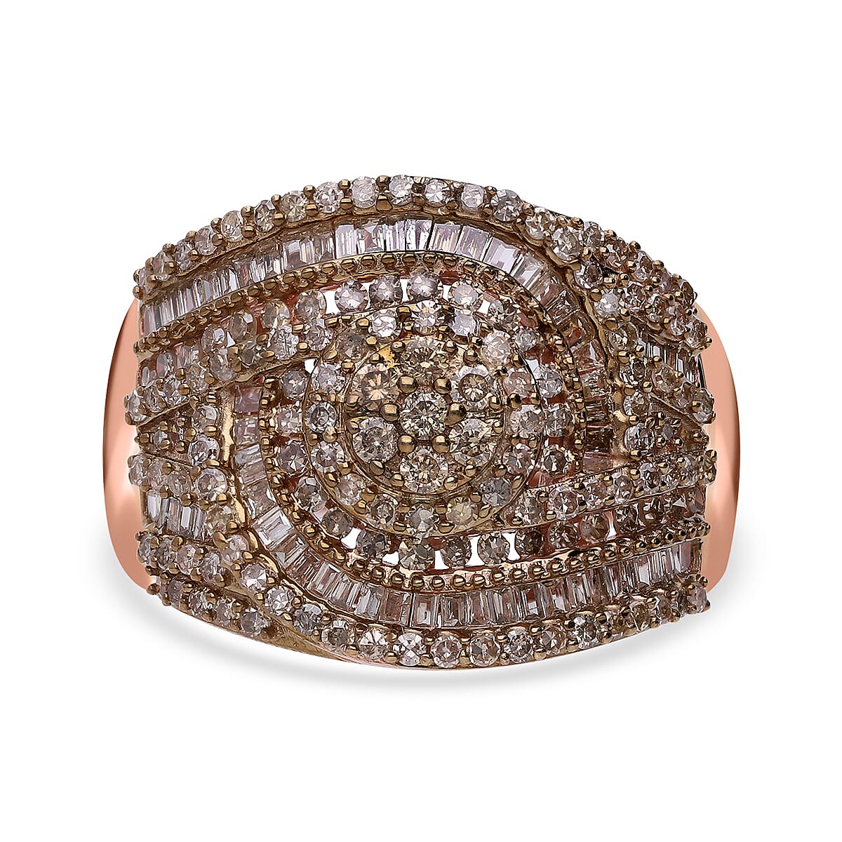 Expertly designed, this diamond ring showcases a cluster natural champagne diamond set in vermeil rose gold over sterling silver. This diamond wedding ring features prong and channel set cluster of round and baguette diamonds.