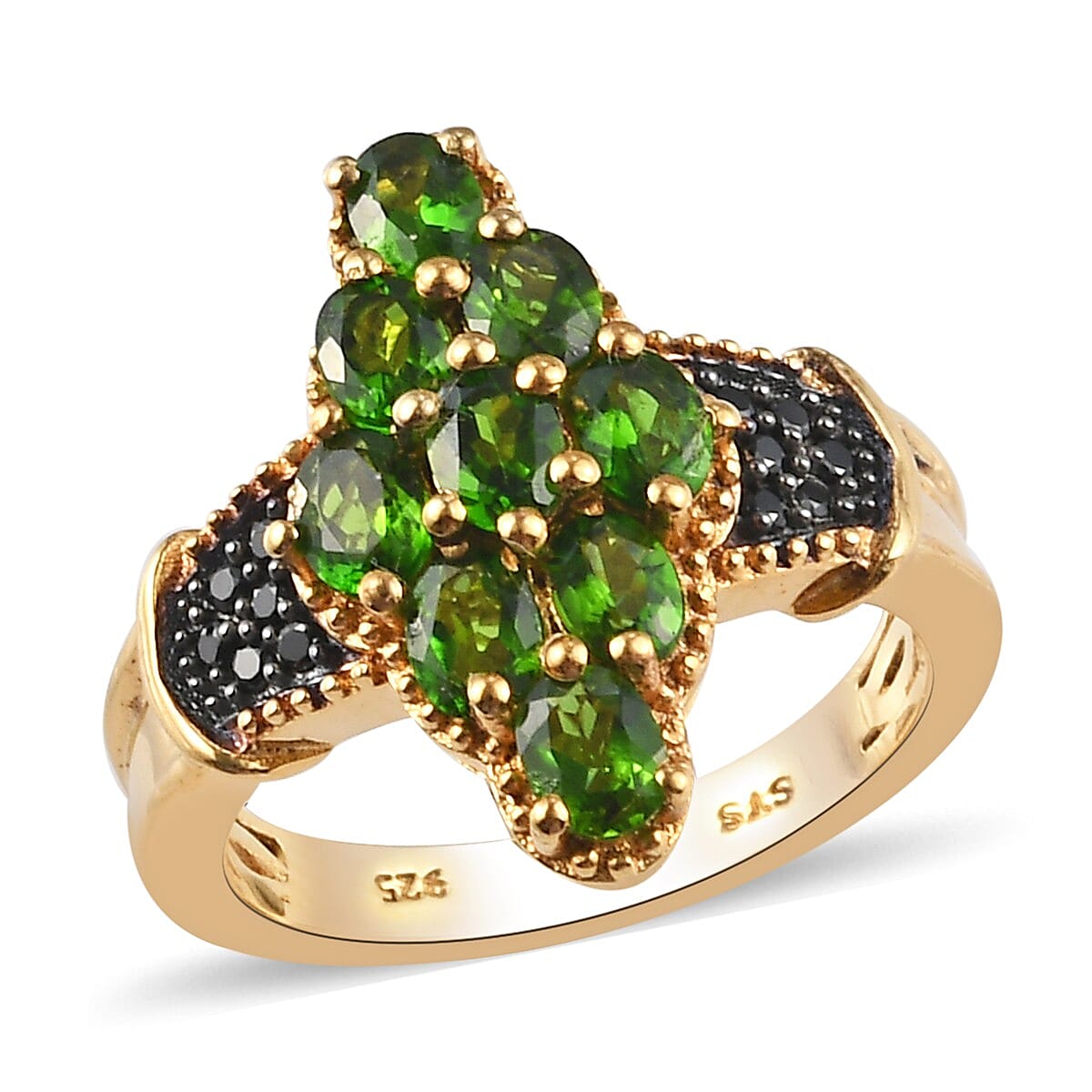 The forefront-covered design of this natural chrome diopside and natural Thai black spinel ring will win many hearts. This ring features an elongated frame of diopside cluster and spinel studded designer shank. This ring frame is complemented by the sparkling milgrain metalwork border, making the design extraordinary. Furthermore, the uniform shape and unspoiled shimmer of spinel give this ring an appearance of exceptional jewelry. Crafted in 14K yellow gold-plated sterling silver.