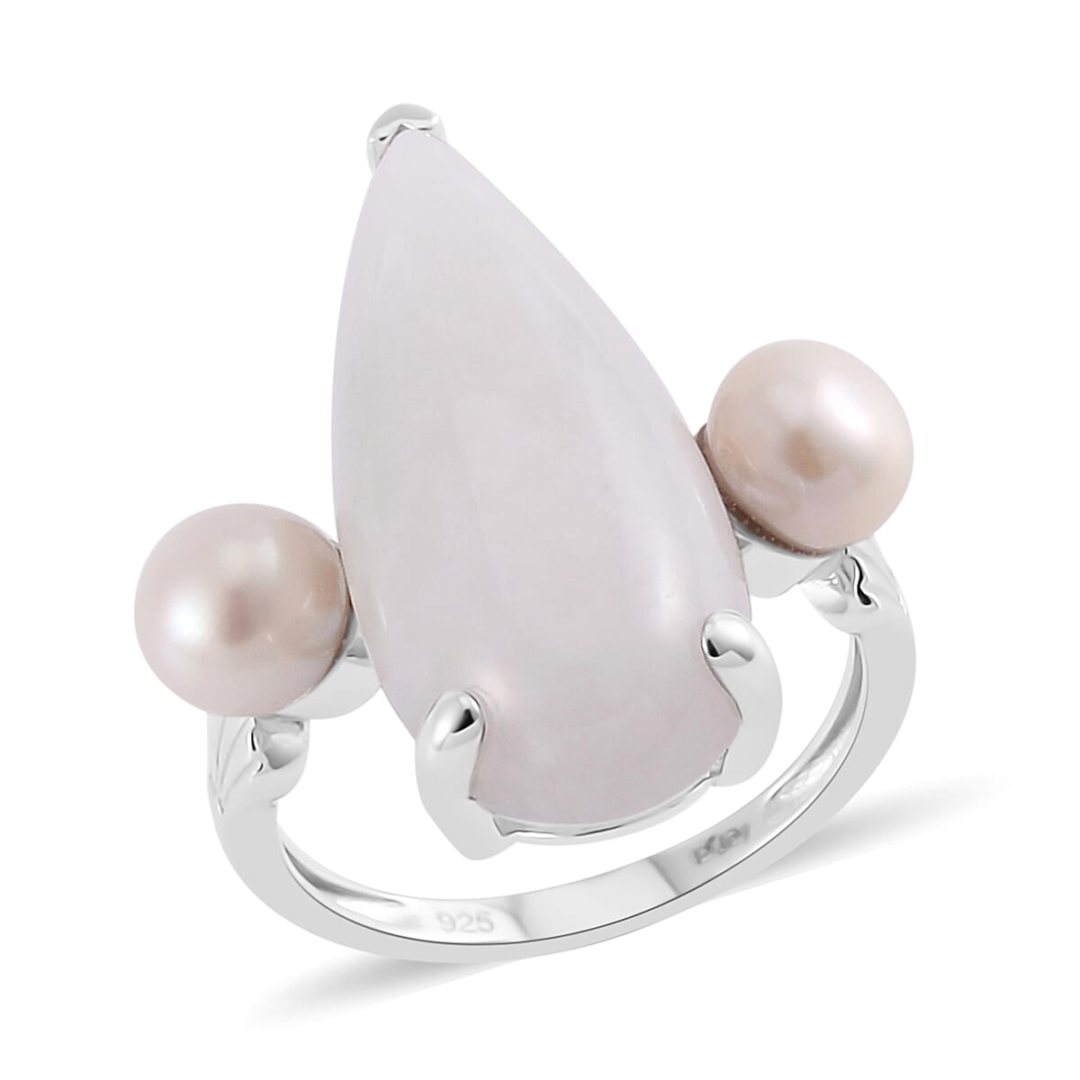 This natural jade ring for women features a pear-shaped jade stone at its center, flanked by freshwater pearls on either side. This freshwater pearl ring is crafted from platinum over sterling silver, showcasing a prong setting for each gemstone.