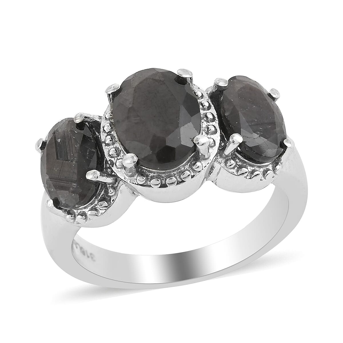 The natural silver sapphire ring in stainless steel is inspired by a trilogy, symbolizing the past, present, and future of relationships. Featuring silver-gray sapphires, a three-stone ring for women is elegant and durable, making it a versatile choice for any occasion.