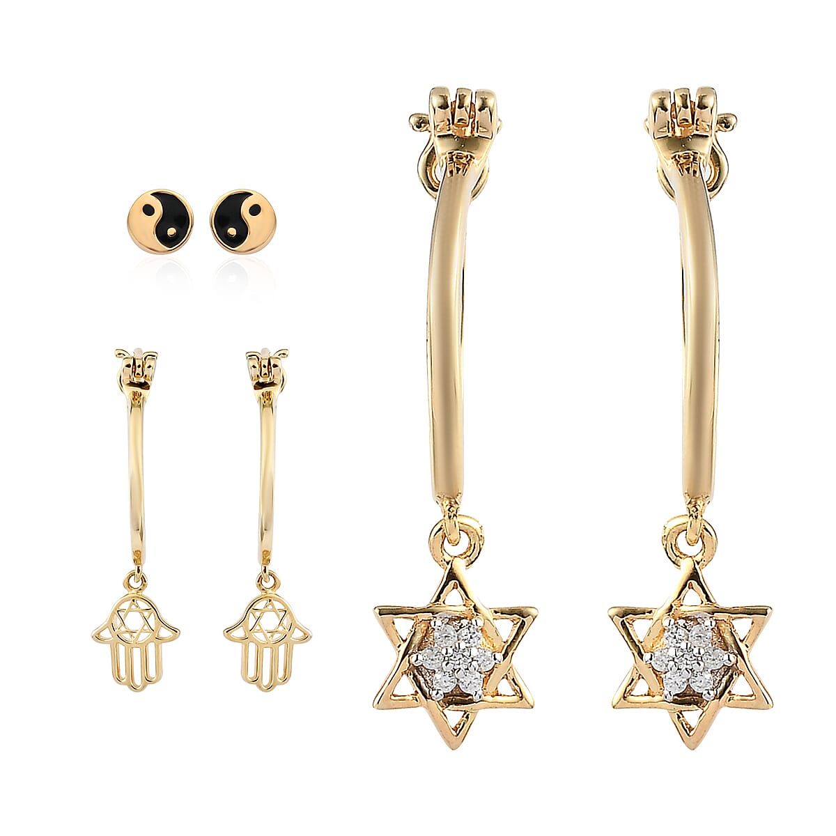 Natural White Zircon Set of 3, 3 Ying Yang Stud & Hamsa and Floral Star of David Dangling Earrings in Vermeil YG Over Sterling Silver 0.10 ctw