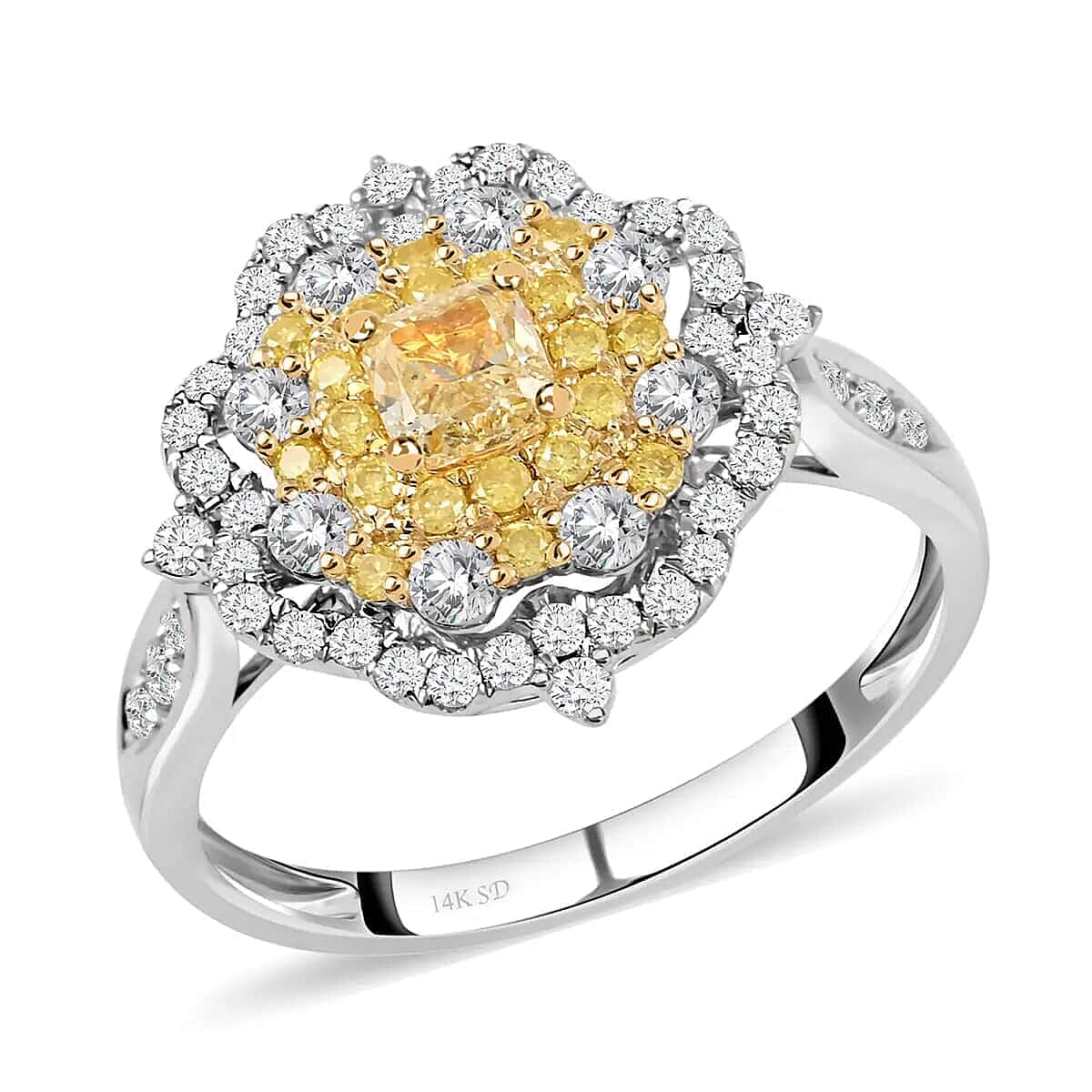 Natural Yellow And White Diamond Flower Ring, Yellow Diamond Ring, Floral Cluster Ring, 14K White Gold Ring, Wedding Ring For Her 1.00 ctw (Size 11)