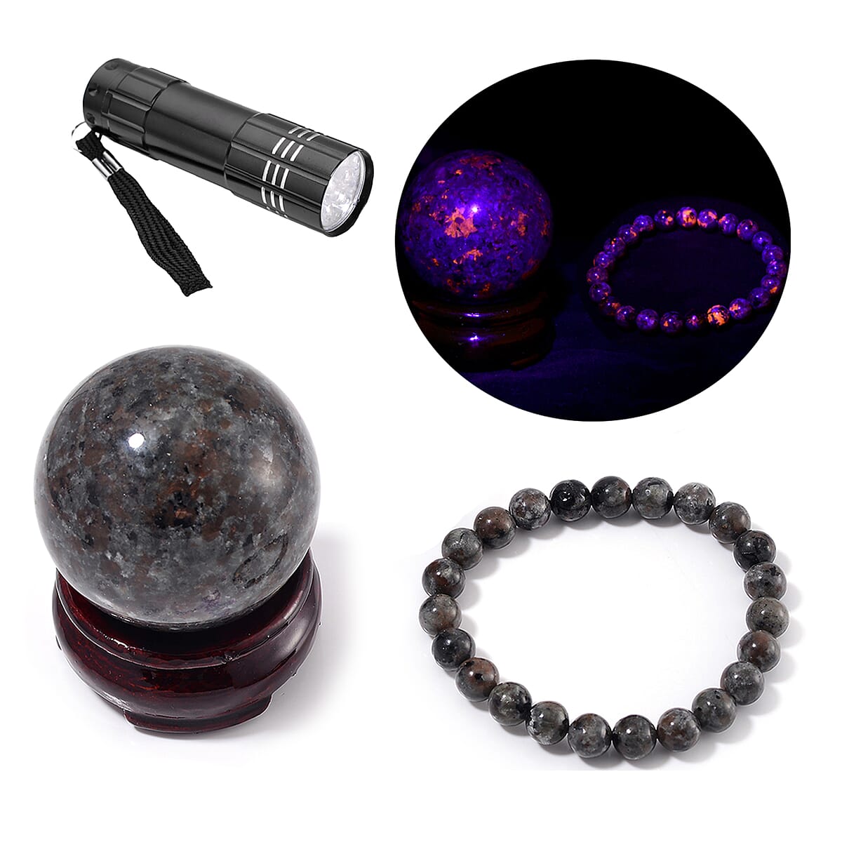 Natural Yooperlite 875.00 ctw Sphere (2.5In) and Beaded 8mm Stretch Bracelet with Free UV Flash Light