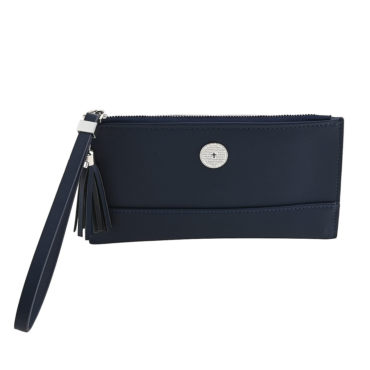 Navy Blue Faux Leather Wristlet Wallet with Lord's Prayer Engraved Detailing and Tassel Charm Zipper in Silvertone