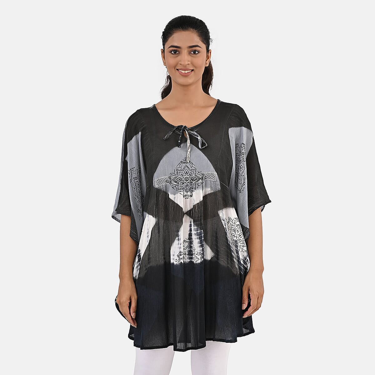 Navy Rayon Crepe Tie Dye Block Print Kaftan with Necktie - One Size Fits Most
