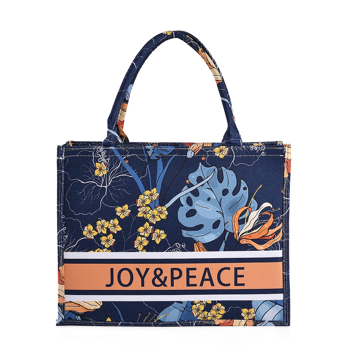 Navy with Multi Color Leaves Printed Hand Washable Tote Bag For Women With Zipper Closure and Handle Drop (17x6.3x13.8)
