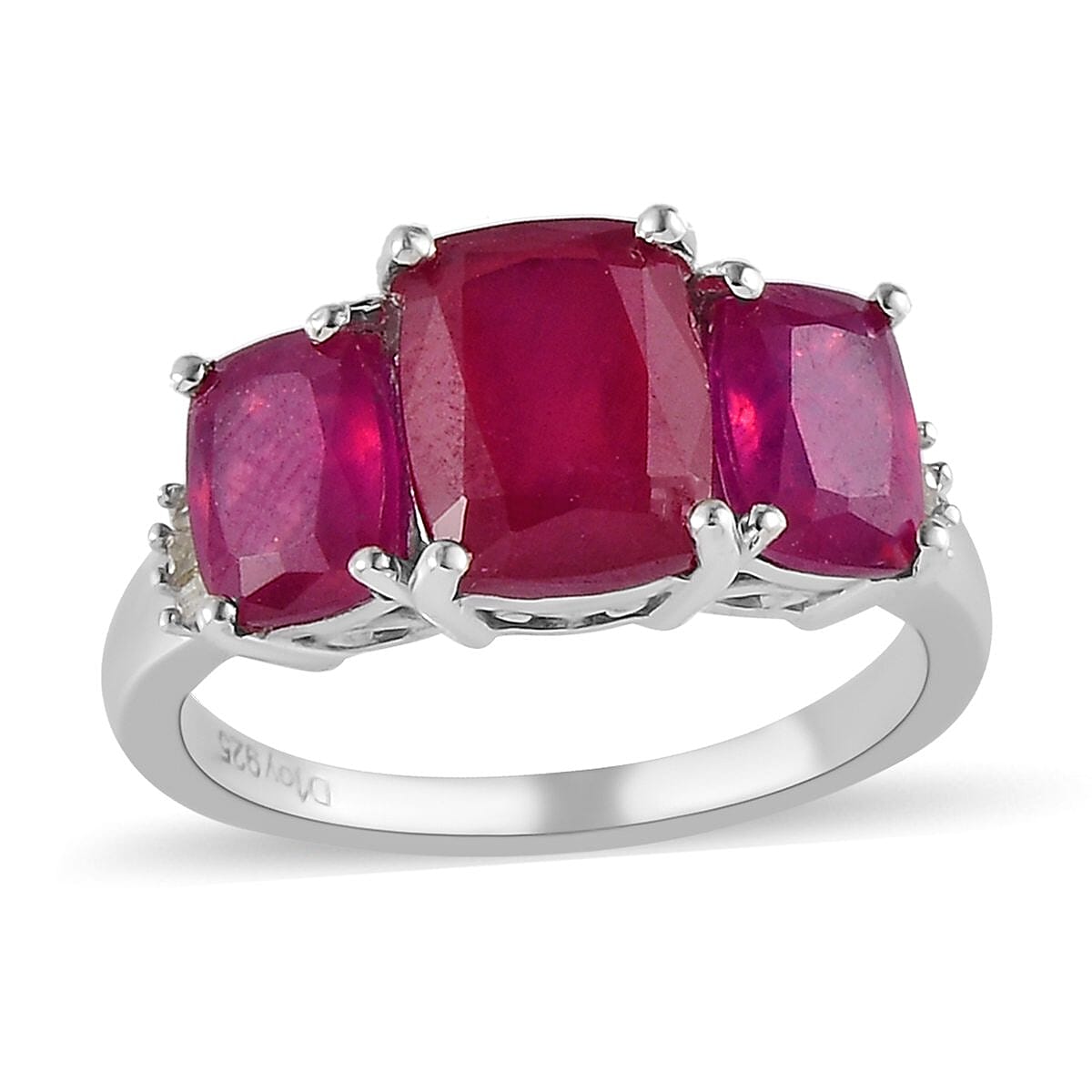 Niassa Ruby (FF) and Diamond 3 Stone Ring in Platinum Over Sterling Silver (Size 10.0) 6.35 ctw