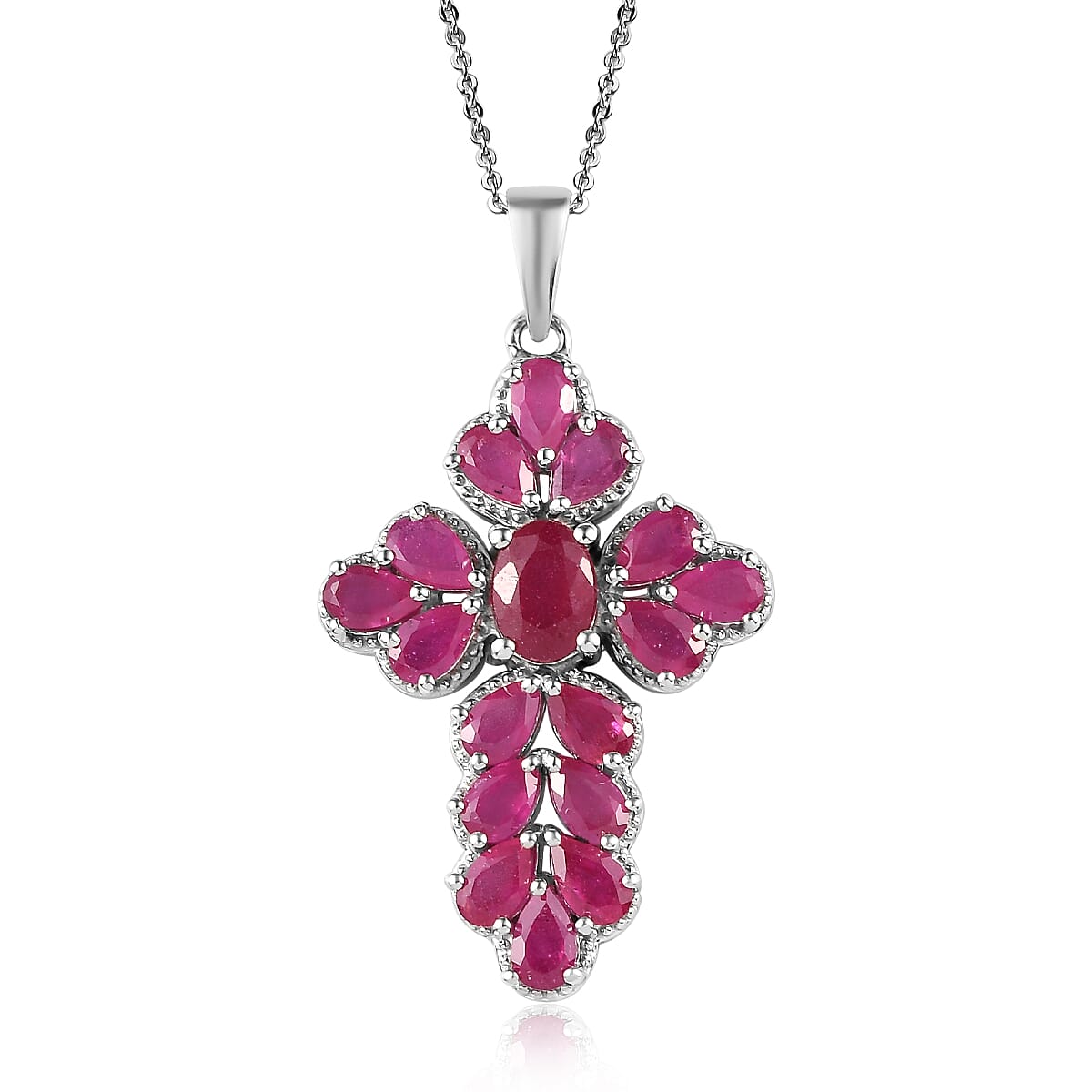 The Holy design of this Niassa ruby Christian cross pendant necklace is a marker of your strong faith and belief in God. Carry your love for the Almighty with you all the time by wearing this cross-pendant necklace. It is crafted in platinum-plated sterling silver.