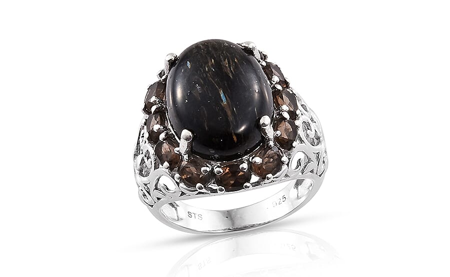 Greenland Nuummite belongs to only a small group of iridescent gemstones. A mixture of anthophyllite and gedrite, the rock possesses an earthy dark brown to black bodycolor, like freshly tilled soil. Sparkling against this backdrop is a tableau of shimmering colors, including red, gold, green, and blue. When expertly cut, this stone takes on a breathtaking life of its own.