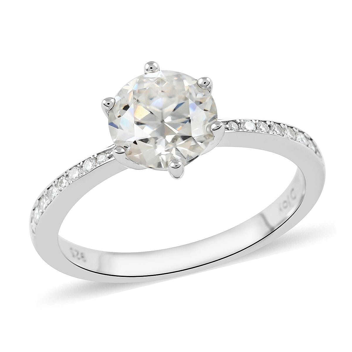 Minimalistic jewelry designs inspire this moissanite ring. The old European cut moissanite is known for its unique faceting pattern, which adds to the ring's charm. The ring is crafted in sterling silver, which adds to the ring's durability. The moissanite on the shank adds a sparkling look.