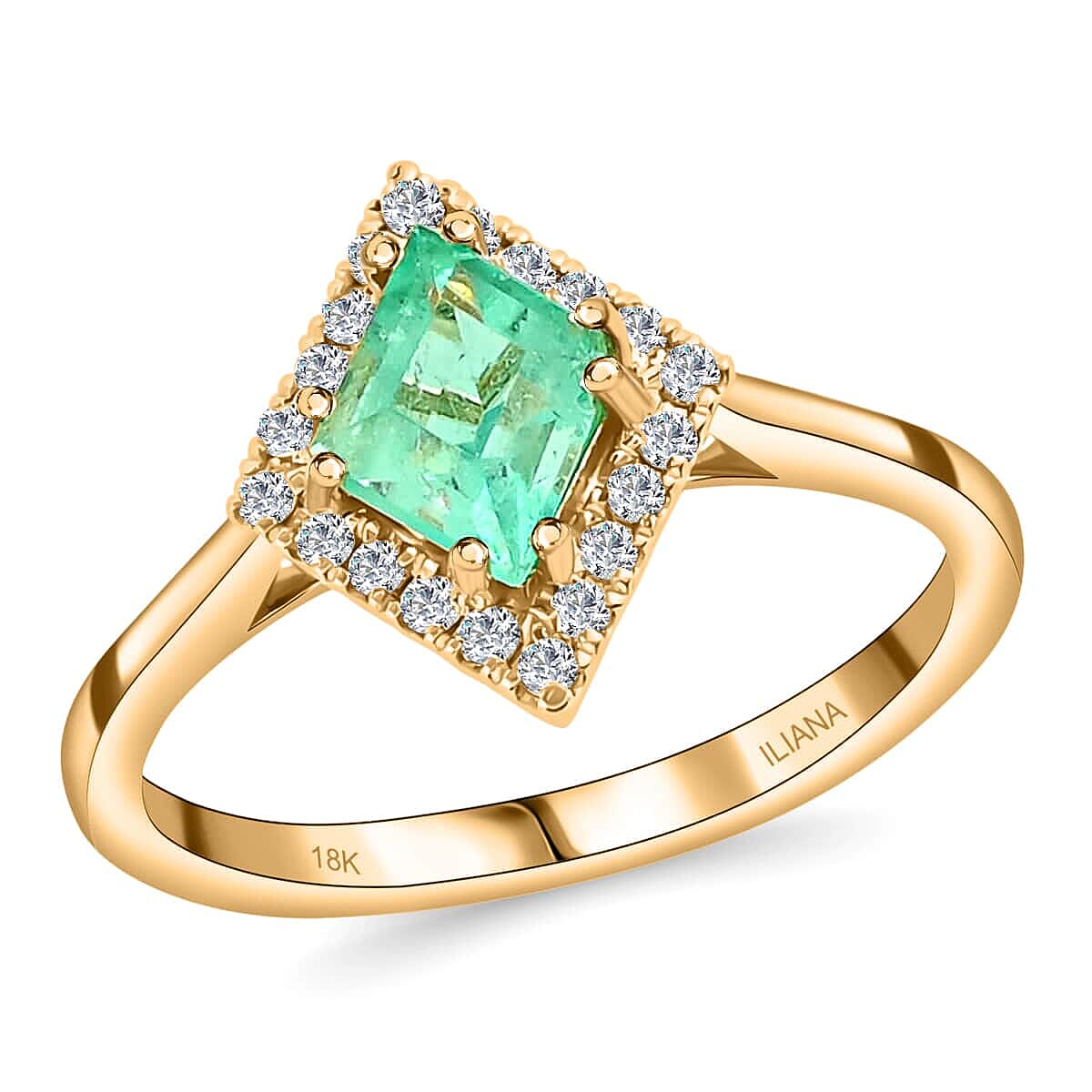 One Of A Kind Iliana AAA Boyaca Colombian Emerald and G-H SI Diamond 1.00 ctw Kite Shape Halo Ring in 18K Yellow Gold (Size 8.5)
