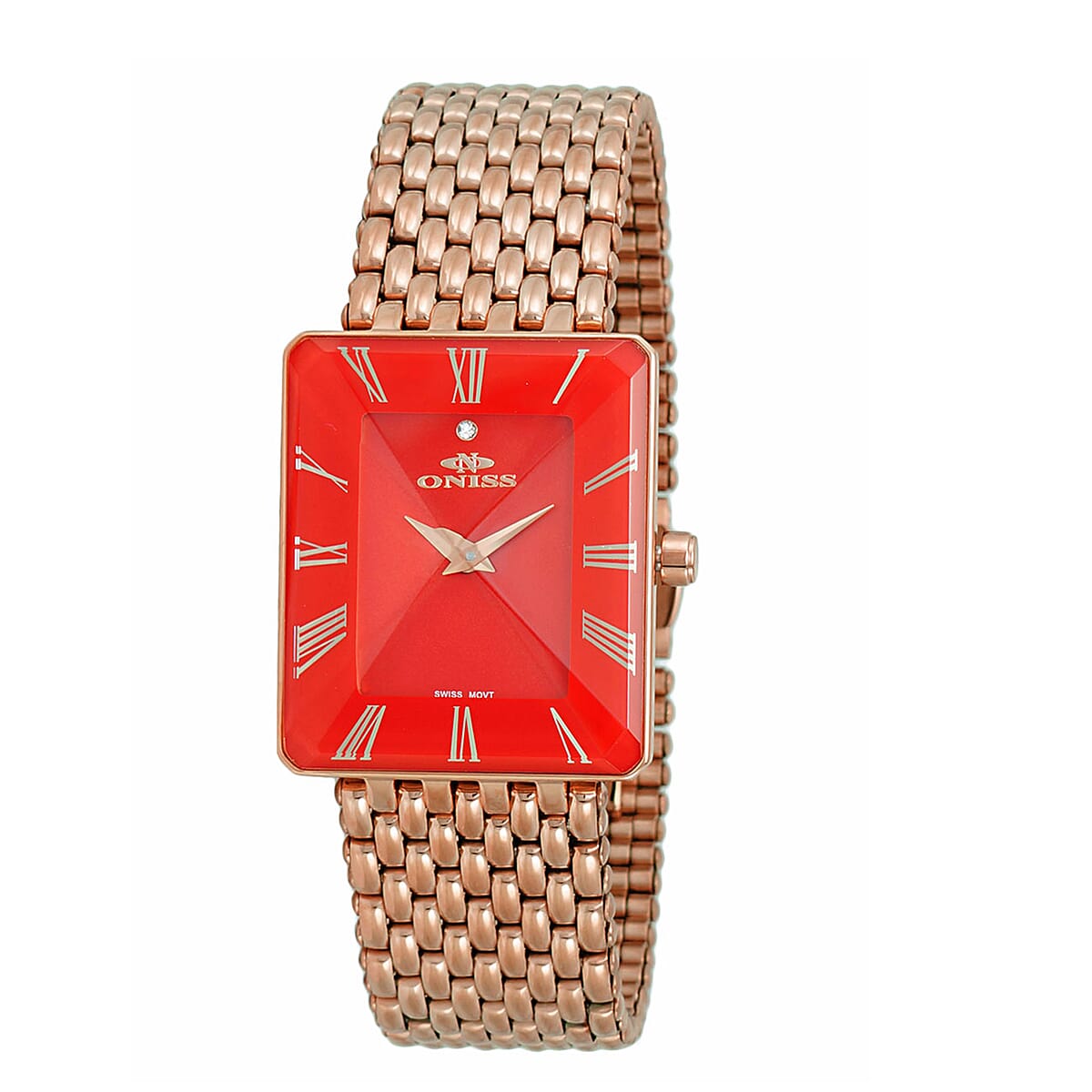 ONISS Austrian Crystal Swiss Movement Sunray Red Dial Watch in ION Plated RG Stainless Steel Strap (27 mm)