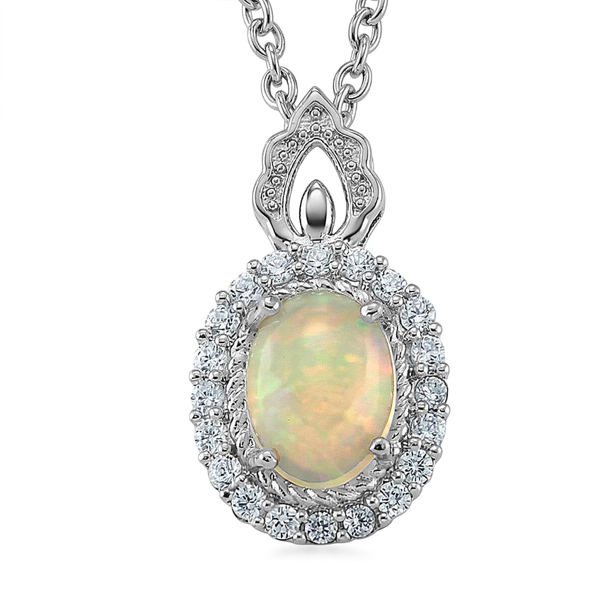 Opal and Simulated Diamond 6.00 ctw Pendant in Silvertone with Stainless Steel Necklace 20 Inches