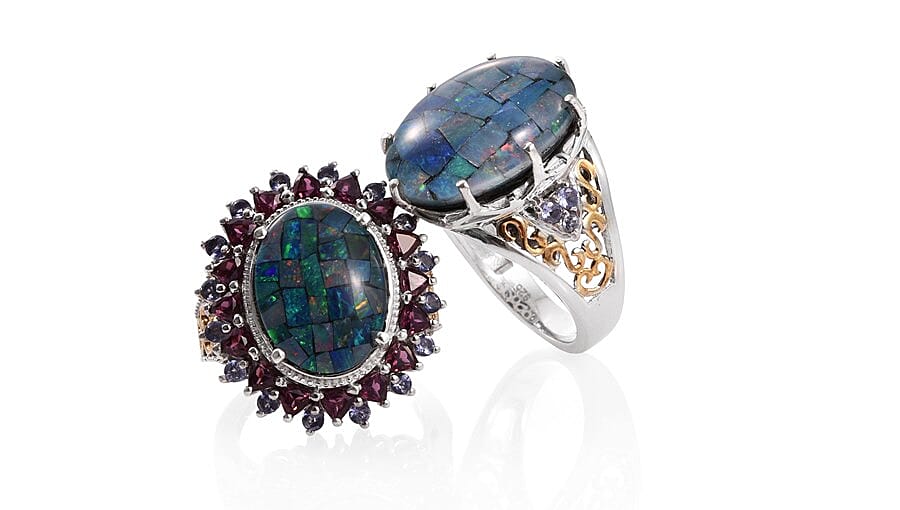 Borrowing from the ancient traditions of mosaic creation, Australian Mosaic Opal is a gemstone assembled from the individual fragments of fiery Australian opals. The finest pieces of opal that cannot be shaped into traditional gems are arranged against a dark field of material. The arrangement is agonized over so that the finished product will possess the expected opal play of color This is then capped with a layer of transparent resin or glass, both to protect the precious opal chips within and to allow more light to play across the shimmering surface of the opal gem composite. Once polished, the finished product can compare to the finest available specimens regarding color and fire.