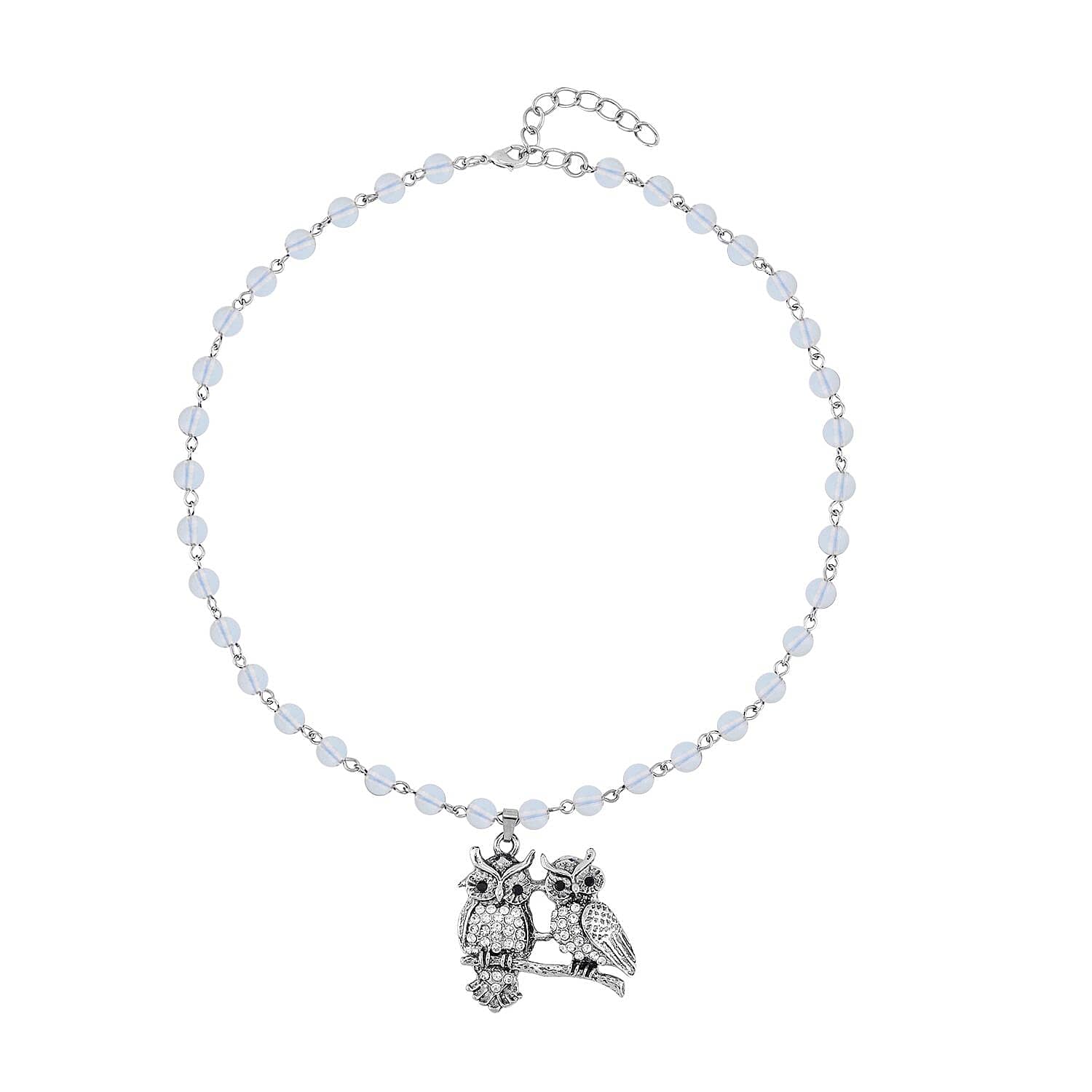 Opalite, White and Black Austrian Crystal 80.00 ctw Owl Couple Necklace in Silvertone 18-20 Inches