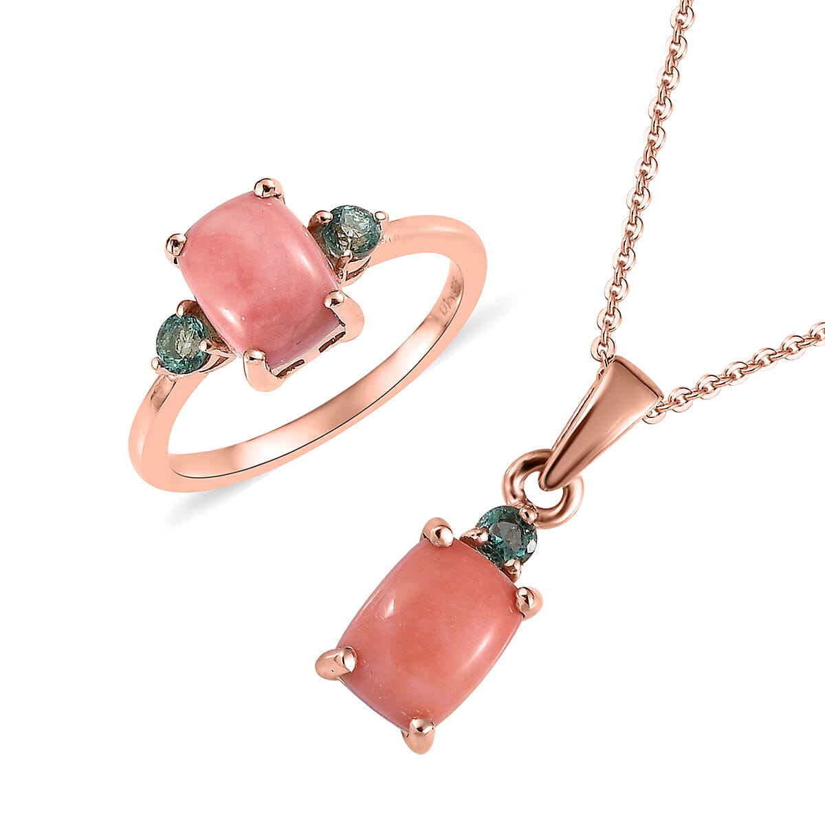Oregon Peach Opal, Boyaca Colombian Emerald Ring (Size 9.0) and Pendant Necklace 20 Inches in Vermeil Rose Gold Over Sterling Silver 2.25 ctw