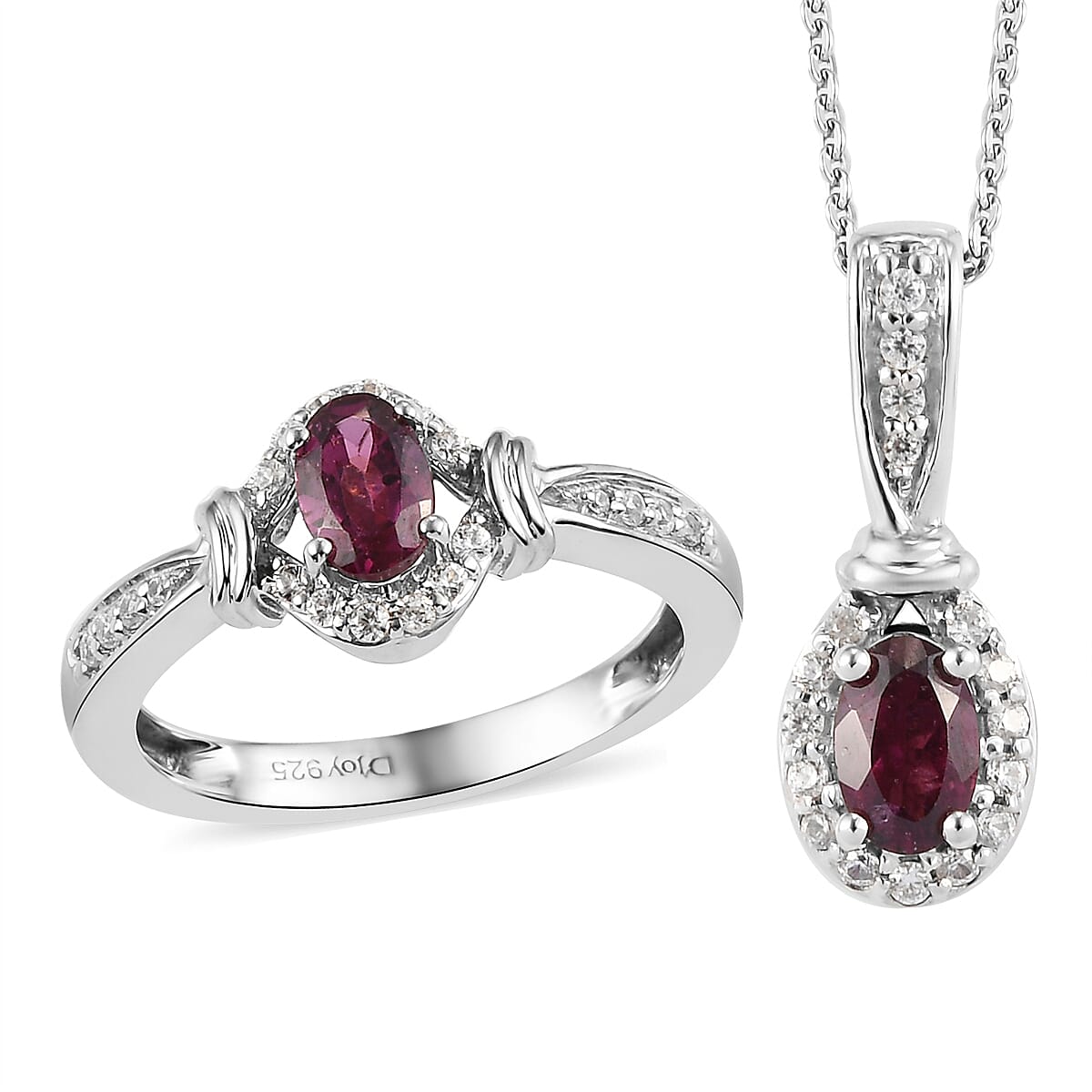 Orissa Rhodolite Garnet and Natural White Zircon Ring (Size 5.0) and Pendant Necklace 20 Inches in Platinum Over Sterling Silver 1.65 ctw
