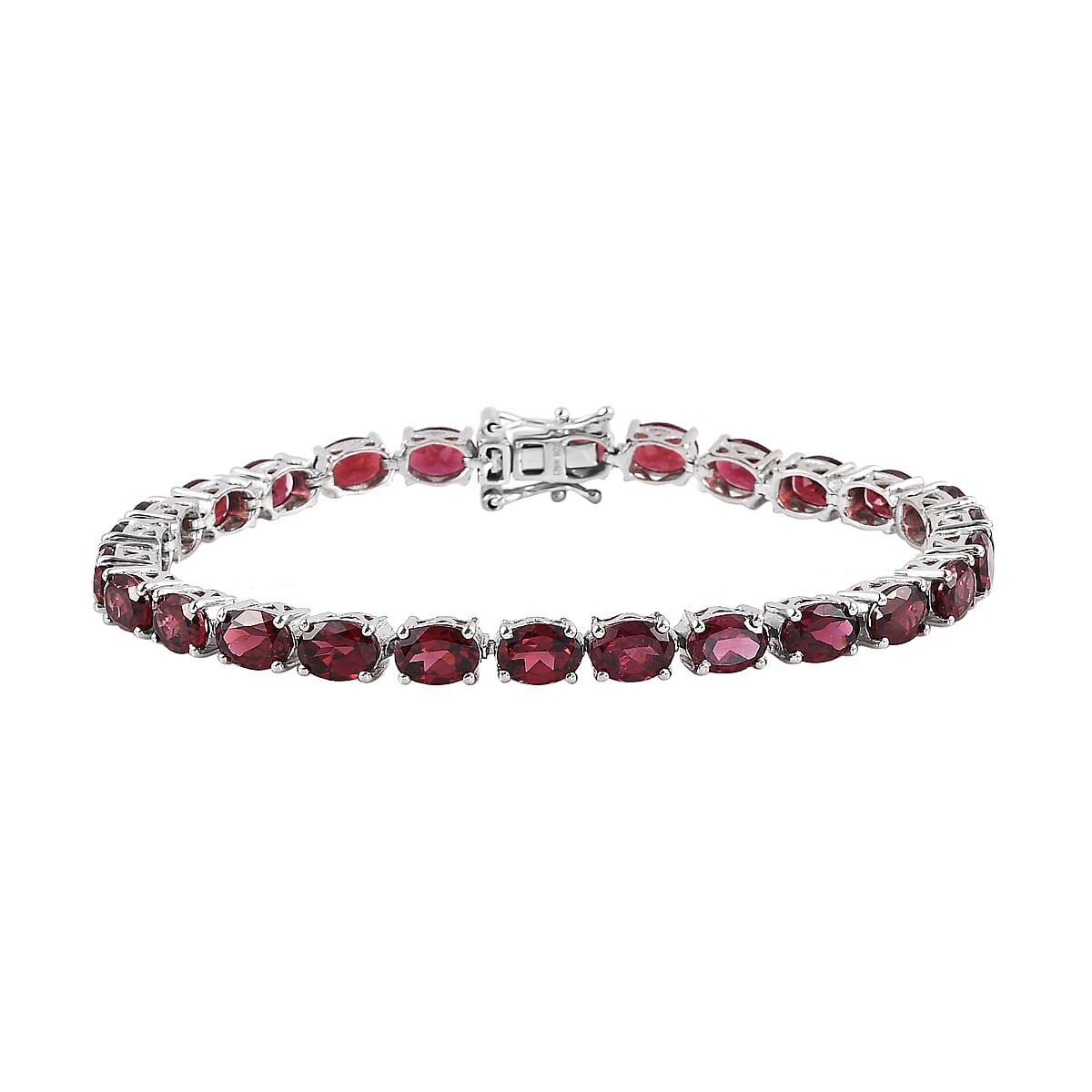 The Orissa rhodolite garnet tennis bracelet draws inspiration from the tennis style. The oval-shaped Orissa rhodolite garnets are sorted and encrusted in the tennis bracelet's frame. This garnet tennis bracelet is crafted in sterling silver with a platinum coating to sustain the shine of the bracelet. The tab insert clasp has a fancy boxlike appearance, ensuring a secure closure with style. Link bracelets are back in the name of the tennis bracelet. Garnet dates back to the ancient Egyptians, capturing the fashion style with its sheen. This garnet bracelet will make you stand out on any occasion.