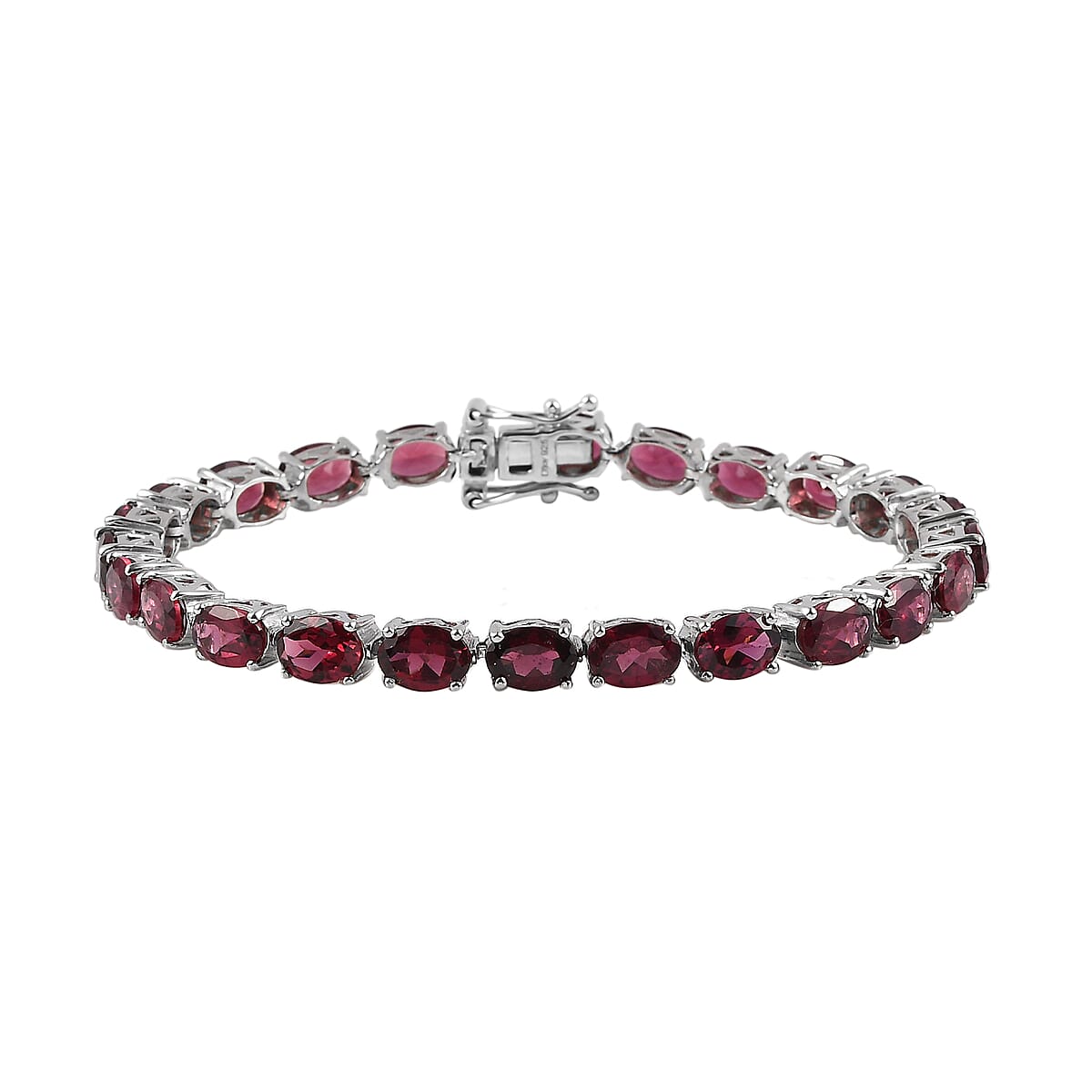 The Orissa rhodolite garnet tennis bracelet draws inspiration from the tennis style. The oval-shaped Orissa rhodolite garnets are sorted and encrusted in the tennis bracelet's frame. This garnet tennis bracelet is crafted in sterling silver with a platinum coating to sustain the shine of the bracelet. The tab insert clasp has a fancy boxlike appearance, ensuring a secure closure with style. Link bracelets are back in the name of the tennis bracelet. Garnet dates back to the ancient Egyptians, capturing the fashion style with its sheen. This garnet bracelet will make you stand out on any occasion.