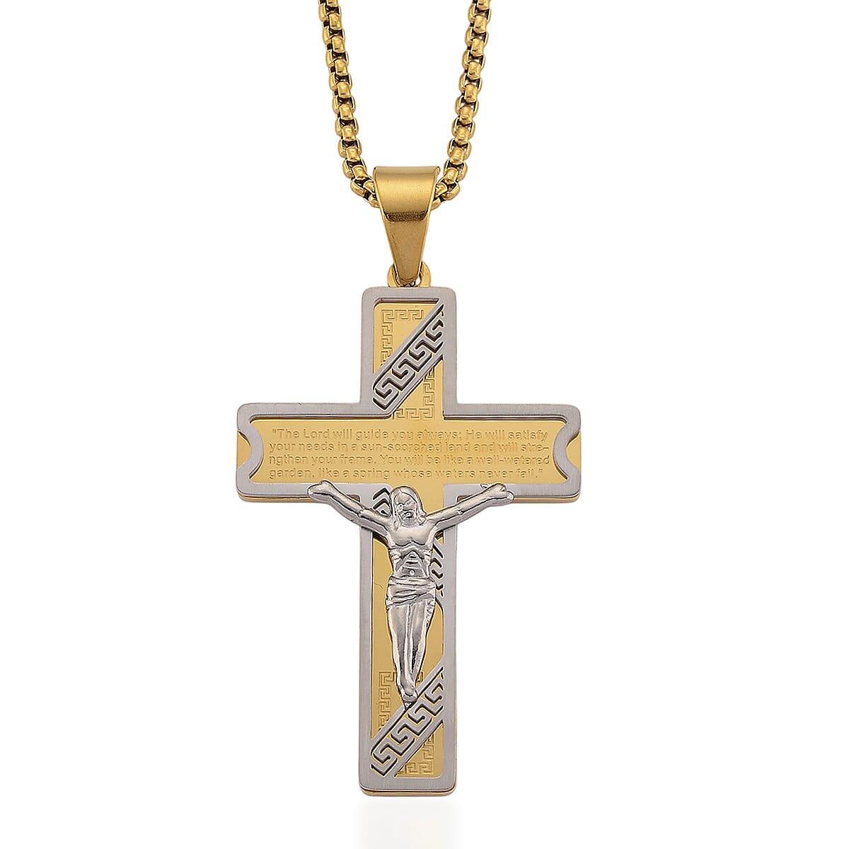 Our Father Two-Tone Crucifix Mens Pendant Necklace (23.5 Inches) in ION Plated YG and Stainless Steel