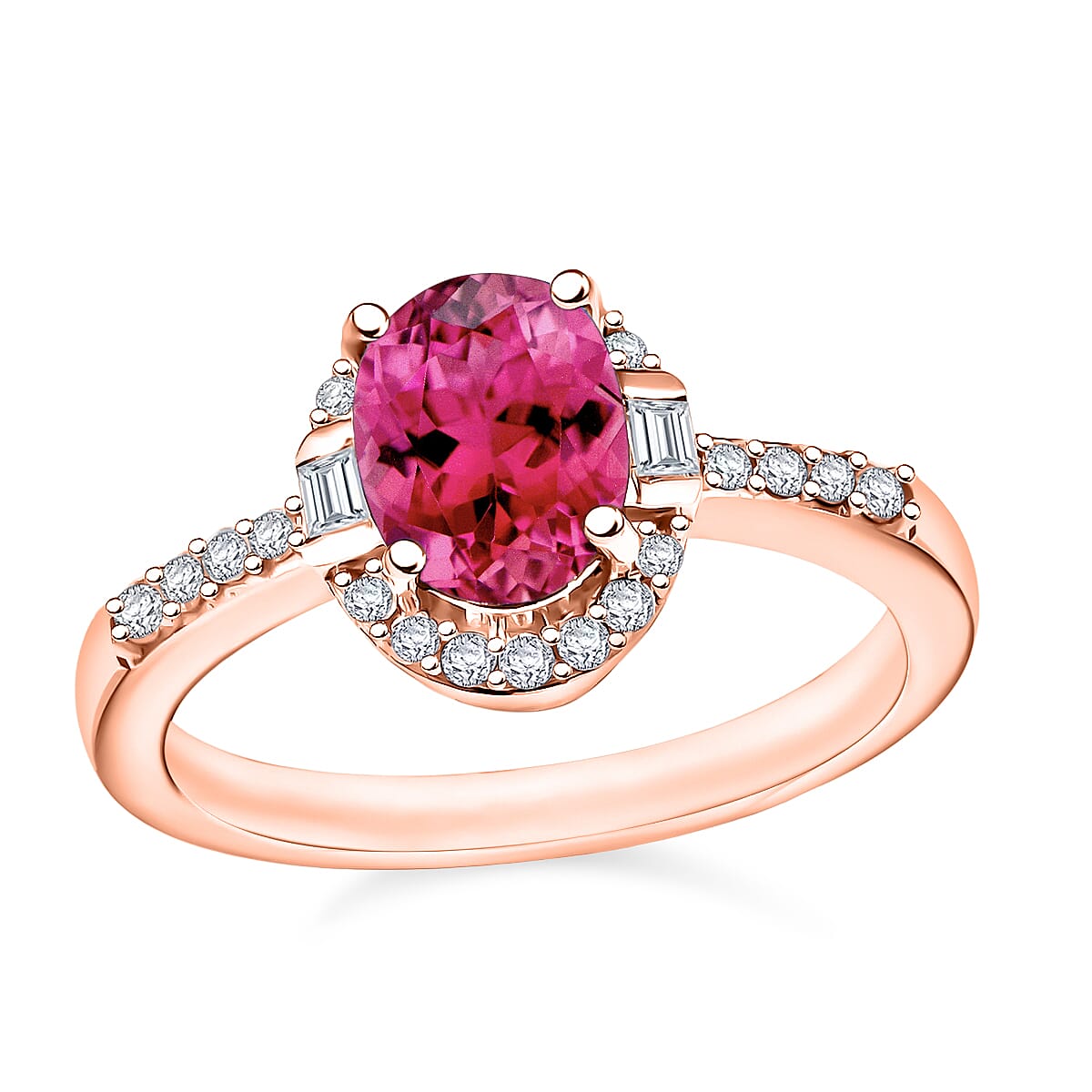 Let your bold beauty shine through with the Ouro Fino rubellite and moissanite ring. The vivid pink-red rubellite radiates your vibrant spirit. Moissanites on the halo and shank bring your elegance to life. With a tapered shank for uniqueness and crafted just for you, this customizable ring speaks from the heart.