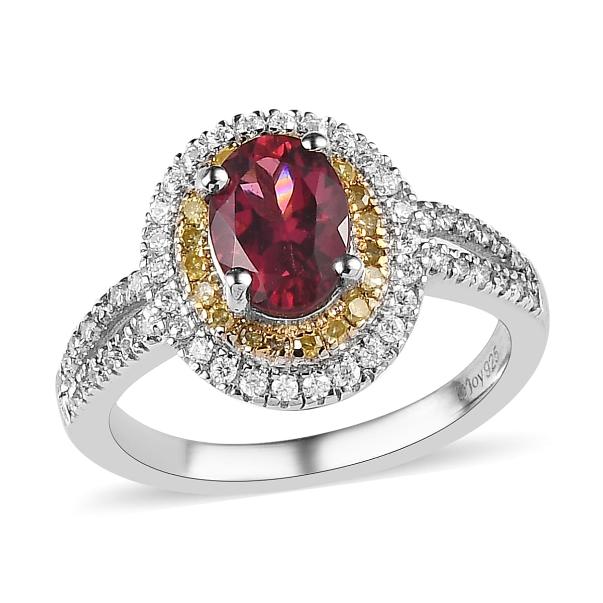Step into a world of unparalleled charm with our Ouro Fino rubellite double halo ring. Set in platinum over sterling silver, the ring features an alluring oval-shaped rubellite in the embrace of a double halo of sparkling moissanites and natural yellow diamonds. Let the romance of this design become your style statement.