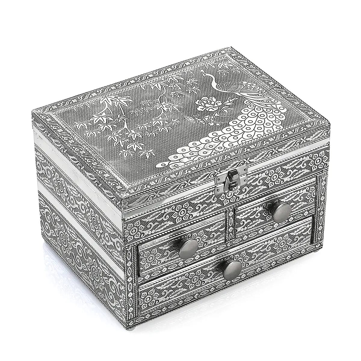 Oxidized Aluminum Peacock Embossed Grand 3 Drawer Jewelry Box