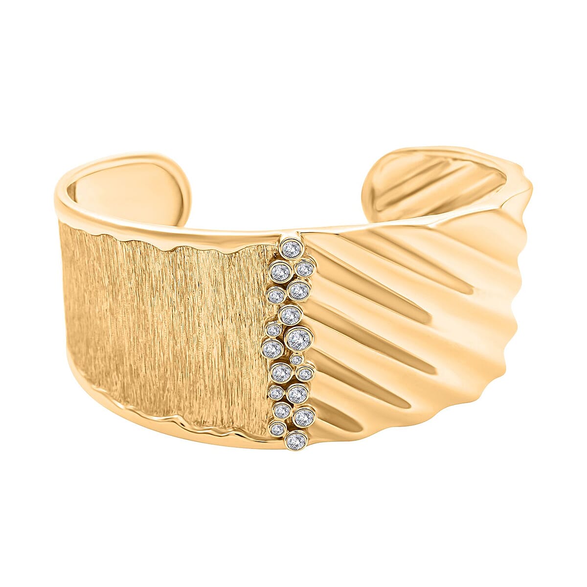 The Clarte kaleidoscope collection moissanite cuff bracelet in sterling silver showcases a sophisticated design inspired by the intricate patterns of a kaleidoscope. This exquisite cuff features a unique wave design on one side and a satin finish with an uneven rim on the other, with vertically set moissanite gems at the center. Crafted with durable and hypoallergenic sterling silver, this silver bracelet embodies strength, power, and protection.