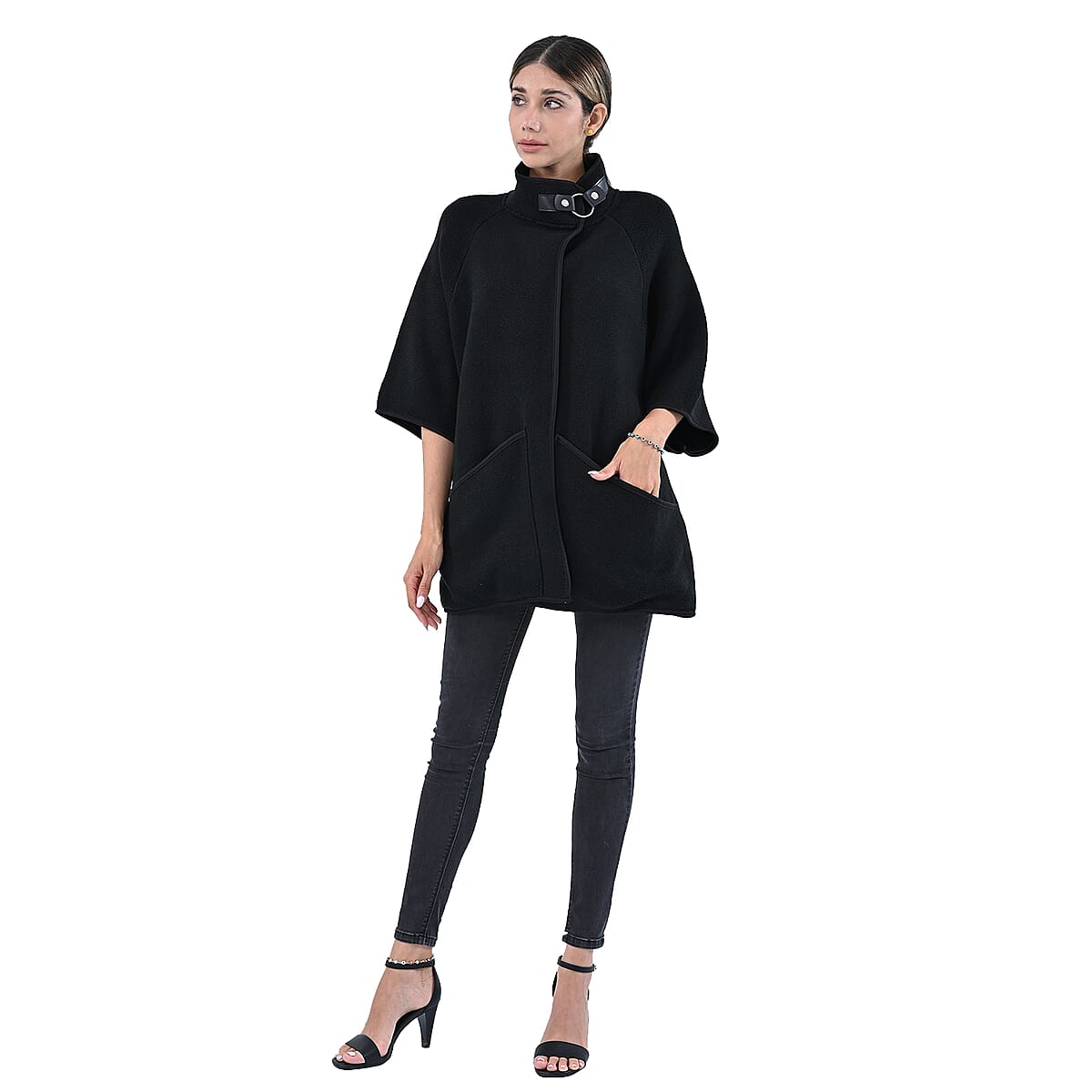 Passage Black Knit Oversized Coat For Women with Stand Collar and Buckle - XL/XXL